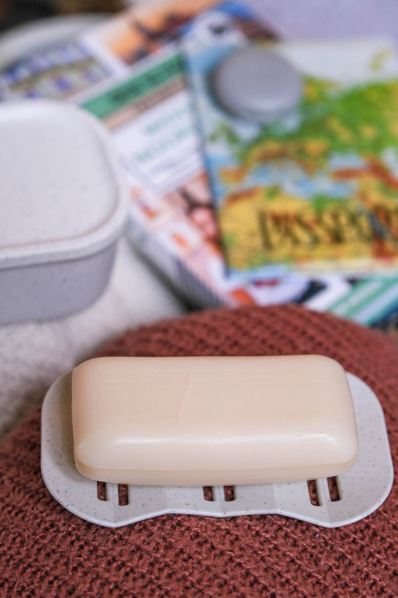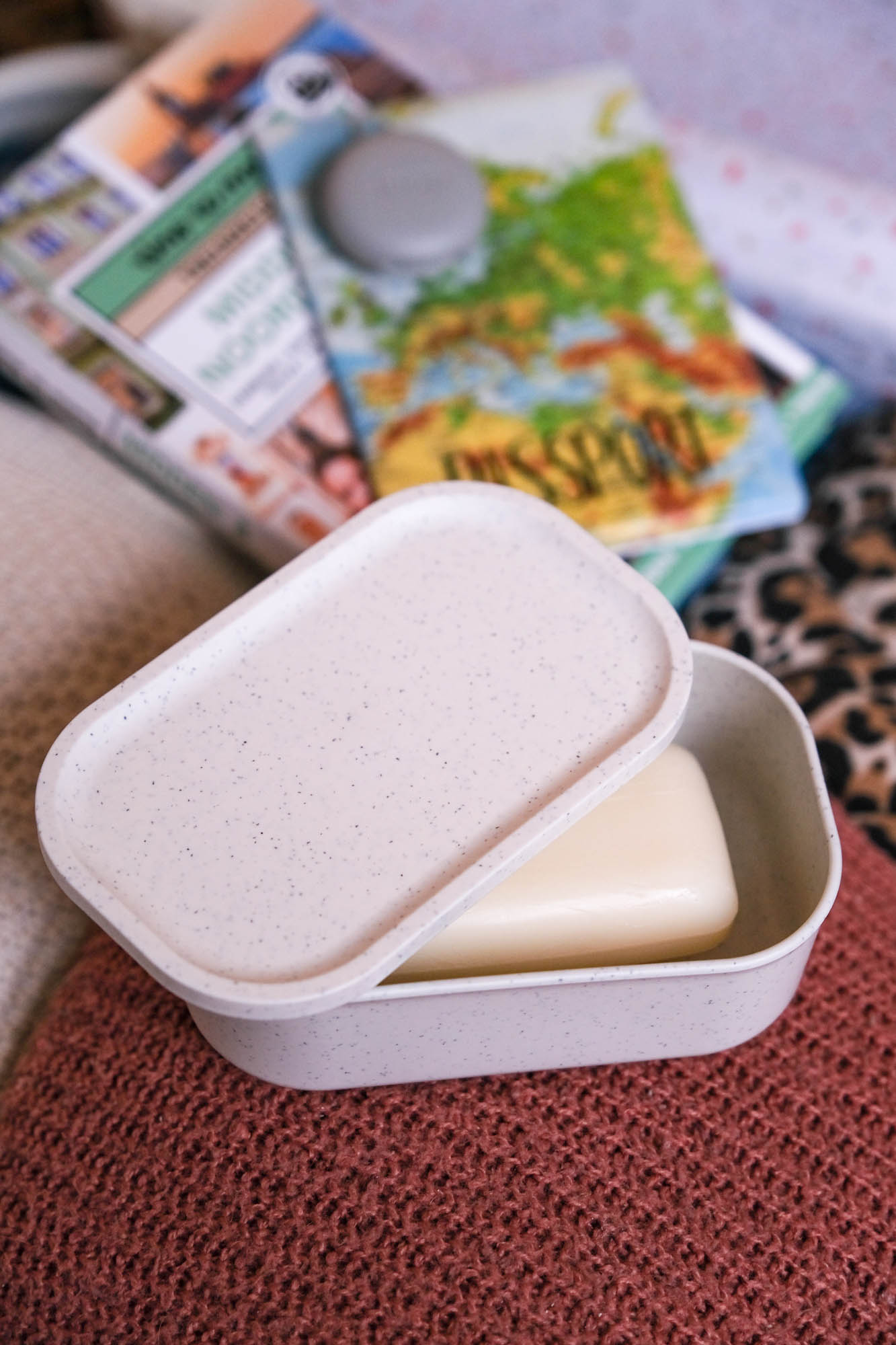 Of we nu voor een lange zomervakantie of alleen maar een weekendje weg inpakken; een blok zeep in een zeepdoosje behoort al jaren bij onze standaard reisbenodigdheden. Meestal kiezen we voor een blok olijfzeep of een andere neutrale en natuurlijke zeep. De hoofdreden is omdat een paar gezinsleden een zeer gevoelige huid hebben en we simpelweg het beste reageren op natuurlijke zepen zonder poespas. Van de extra ingrediënten in vloeibare handzepen krijgen we soms uitslag of eczeem.