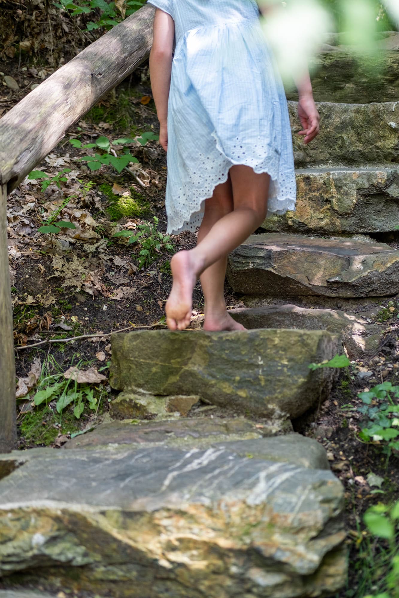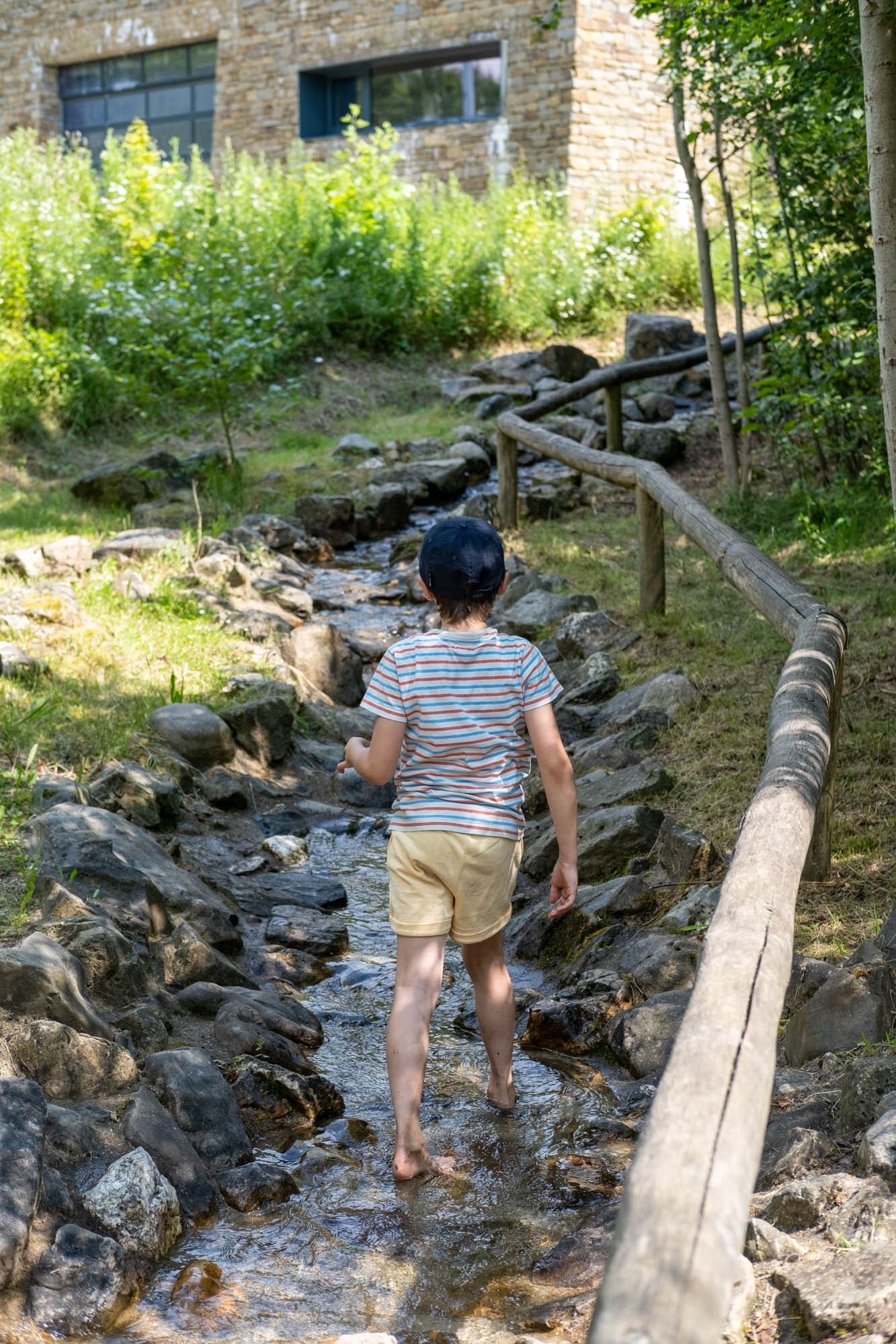 Aan het eind van de route, als de voetjes echt zwart zijn van het zand en de modder, loop je via een kabbelend beekje weer omhoog, naar het eind van het blote voetenpad. Zo worden je benen al een beetje schoon.