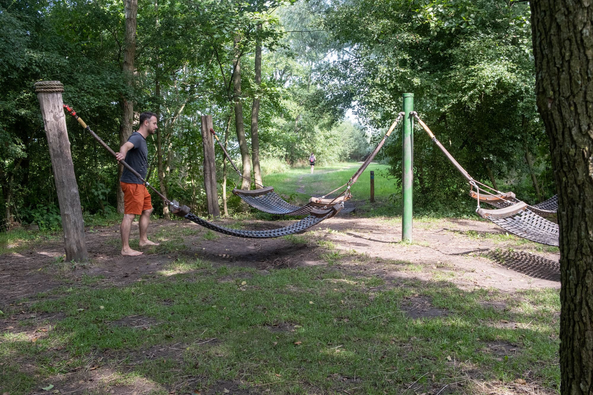 Even uitrusten tijdens de blote voetenwandeling kan ook. Op de route vind je bankjes, picknicktafels en zelfs hangmatten. Maar je kunt natuurlijk ook lekker languit zitten (of liggen) in het gras.