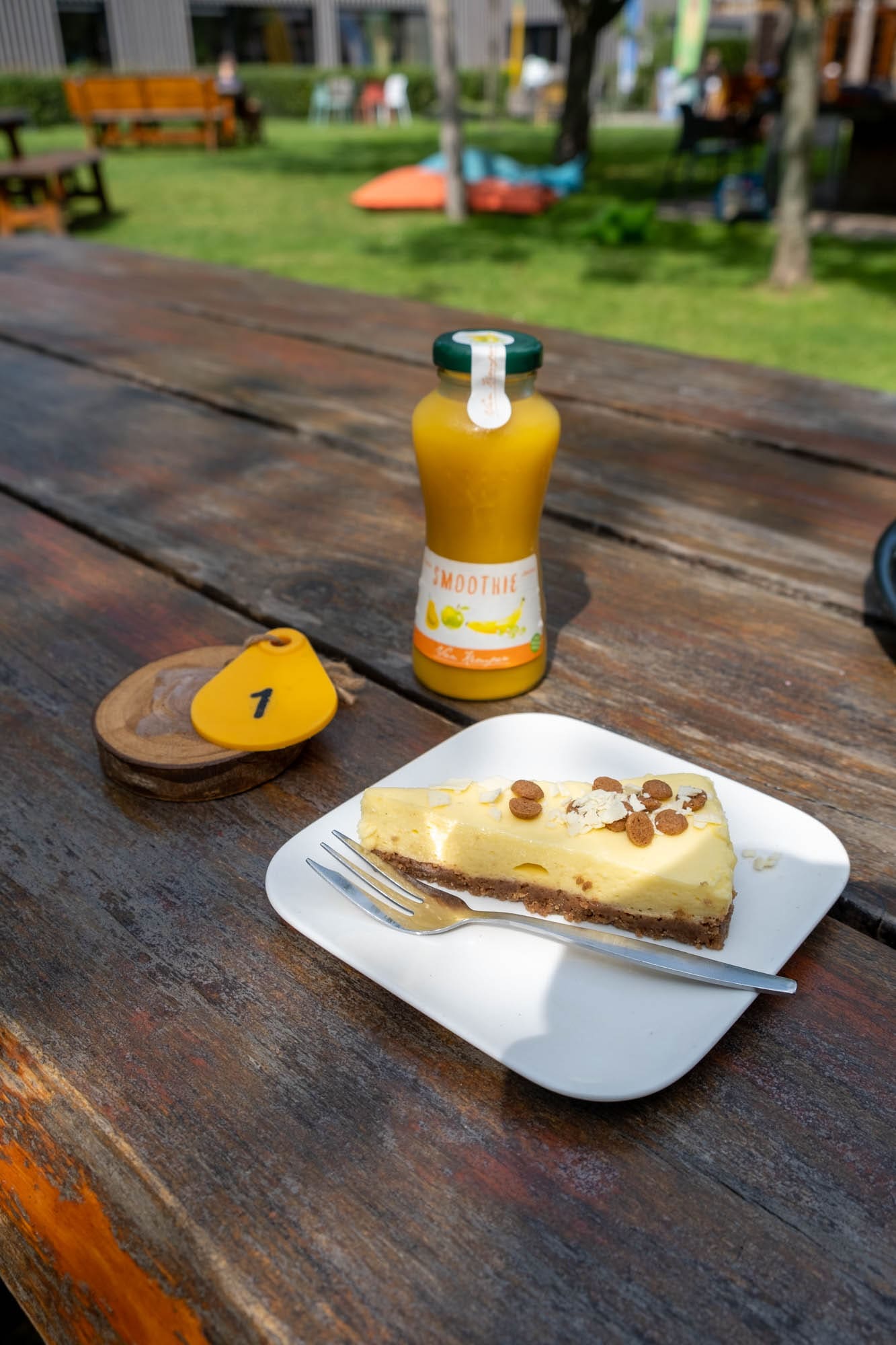 Op het terras kun je plaatsnemen aan een van de tafeltjes of even languit liggen in de gekleurde zitzakken. Je kunt deze pitstop ook benutten om even naar het toilet te gaan.