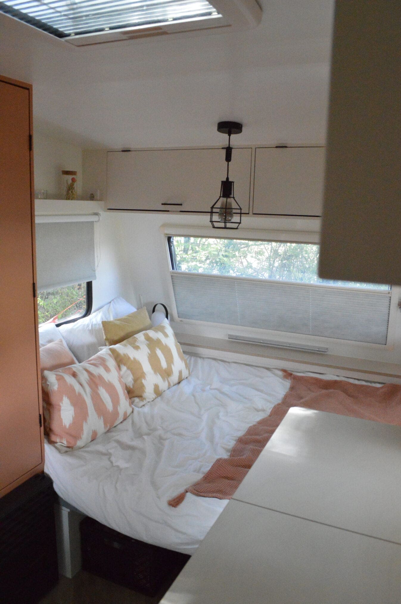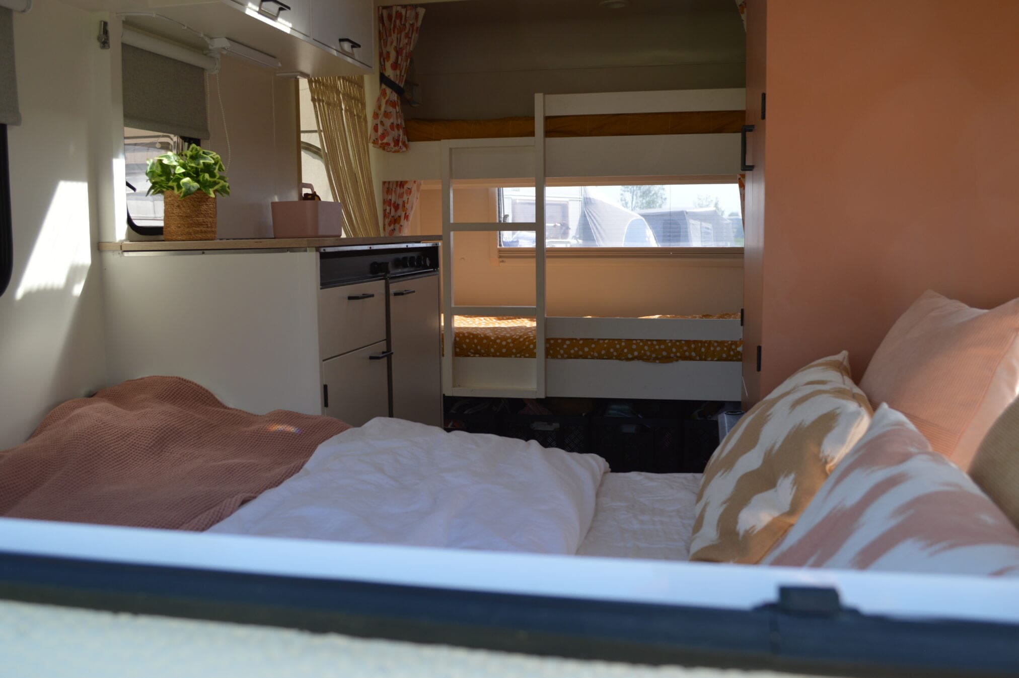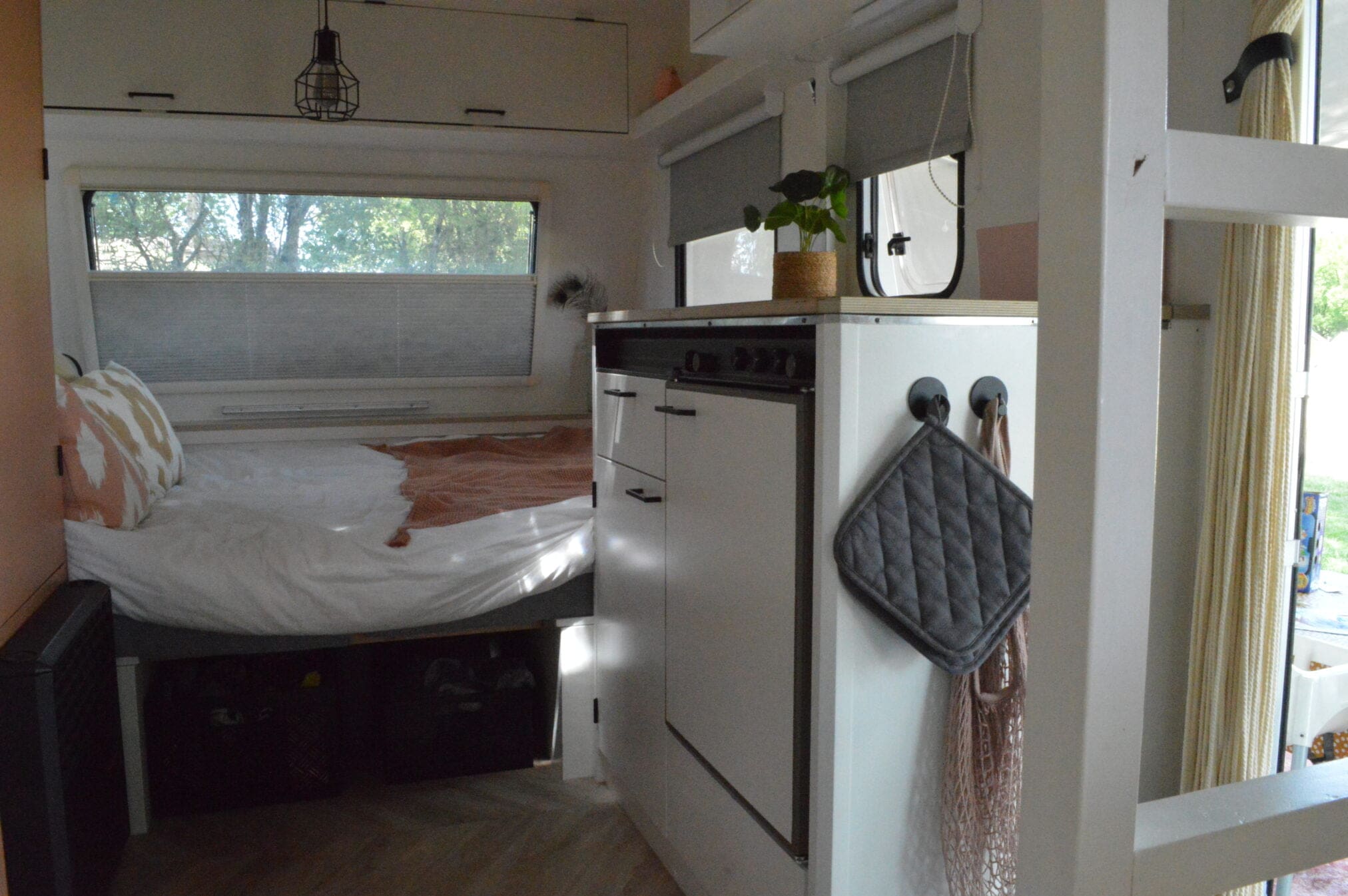 De caravan is toen we hem overnamen, helemaal gestript. We hebben hem helemaal zelf en naar eigen smaak omgebouwd. Hierdoor voelt het heel eigen, echt als ons plekje. Het is ons tweede huisje op wielen geworden, waar we op het moment dat we hem weer uit de stalling halen, alle vier heel blij van worden.
