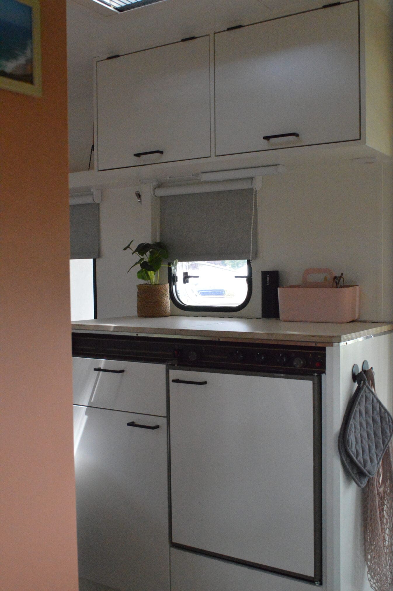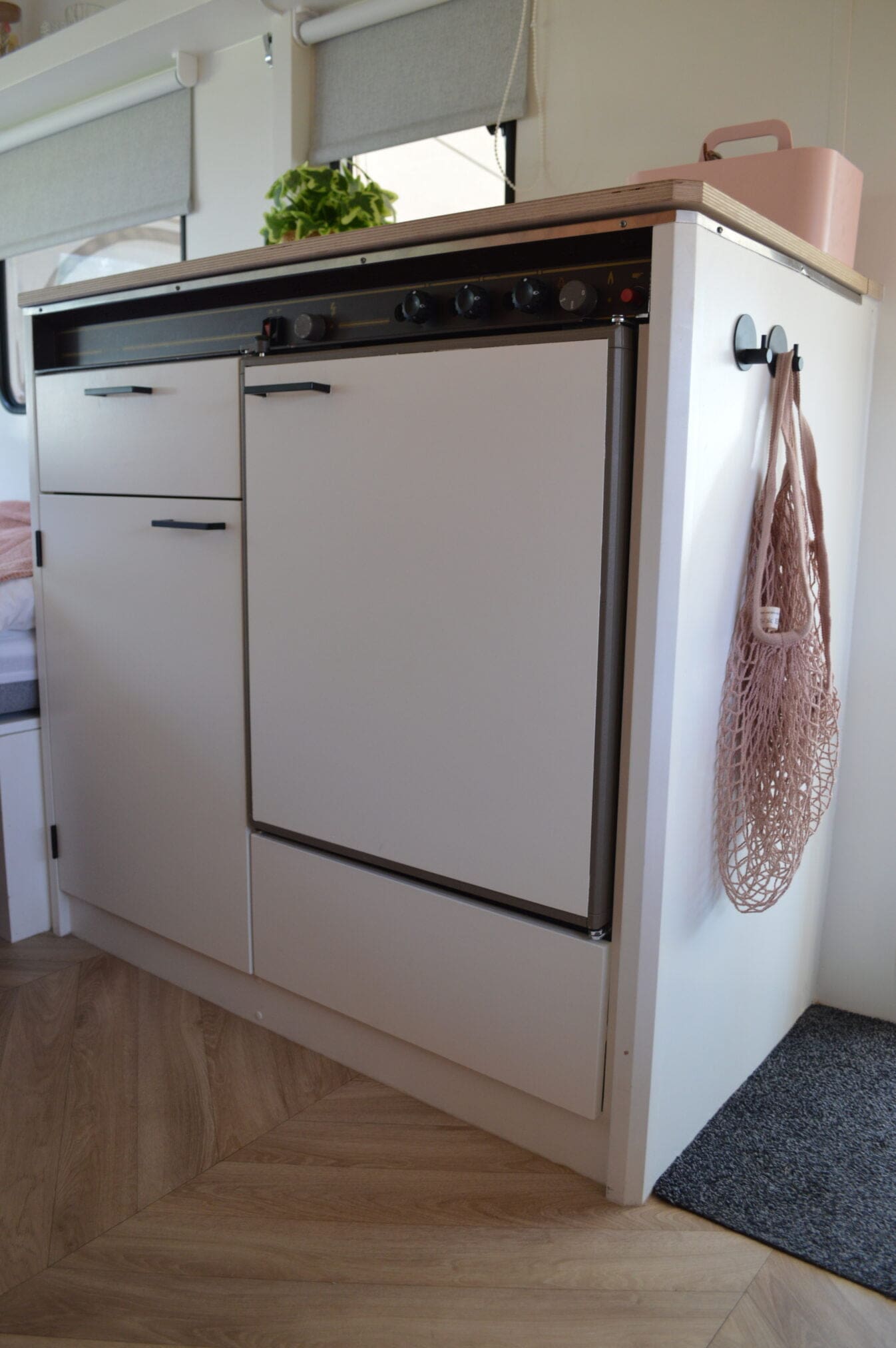Het keukenblok is compact, maar toch van alle gemakken voorzien. De voormalige keuken was bruin, maar met nieuwe, lichte keukenkastjes, leuke handgrepen en mooi aanrechtblad past deze hoek helemaal bij de rest van de caravan.