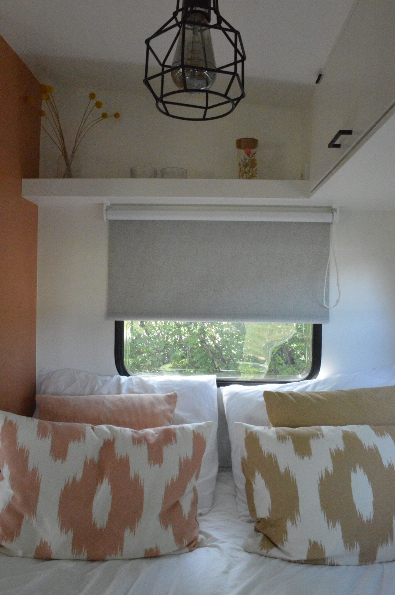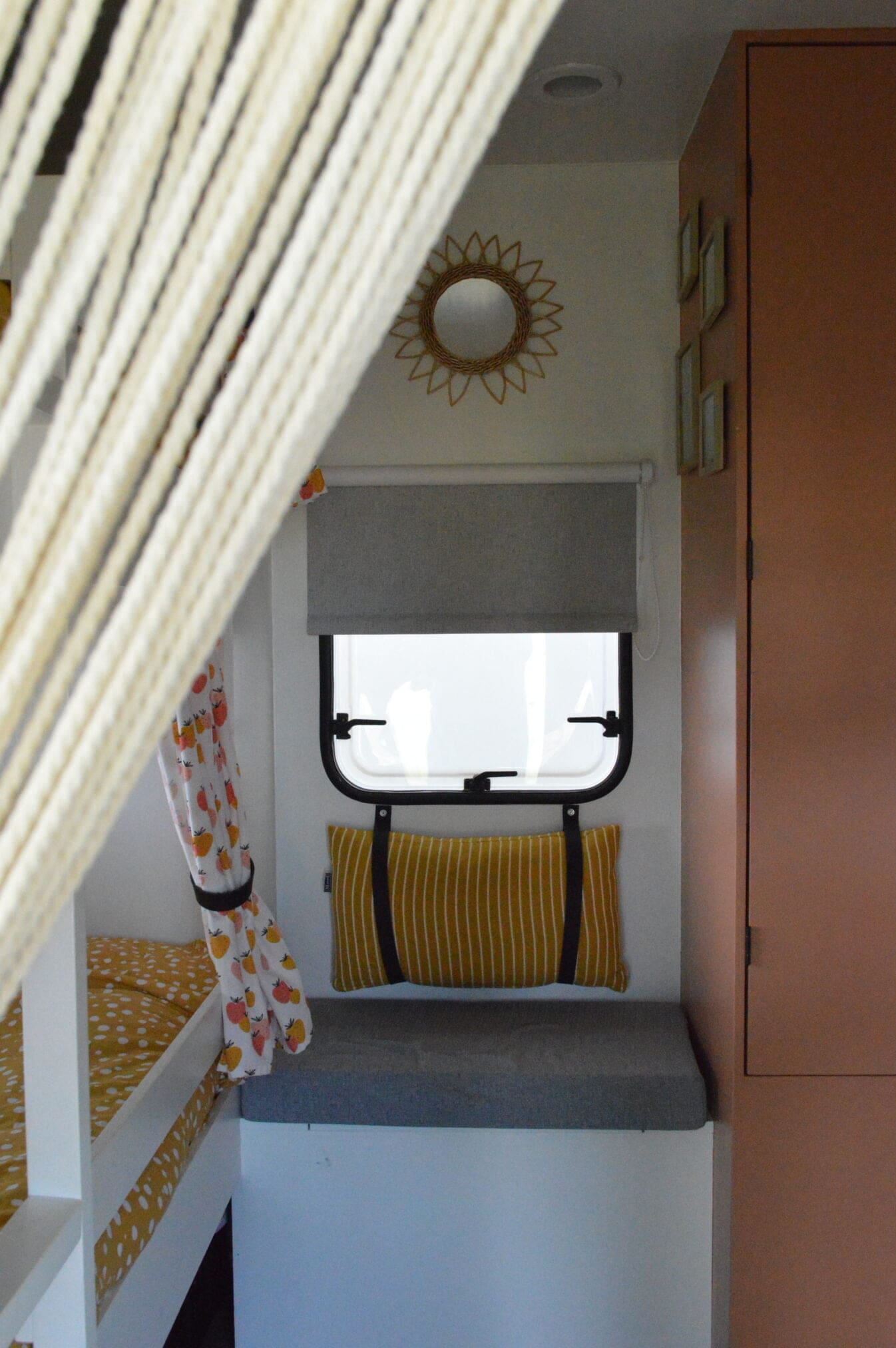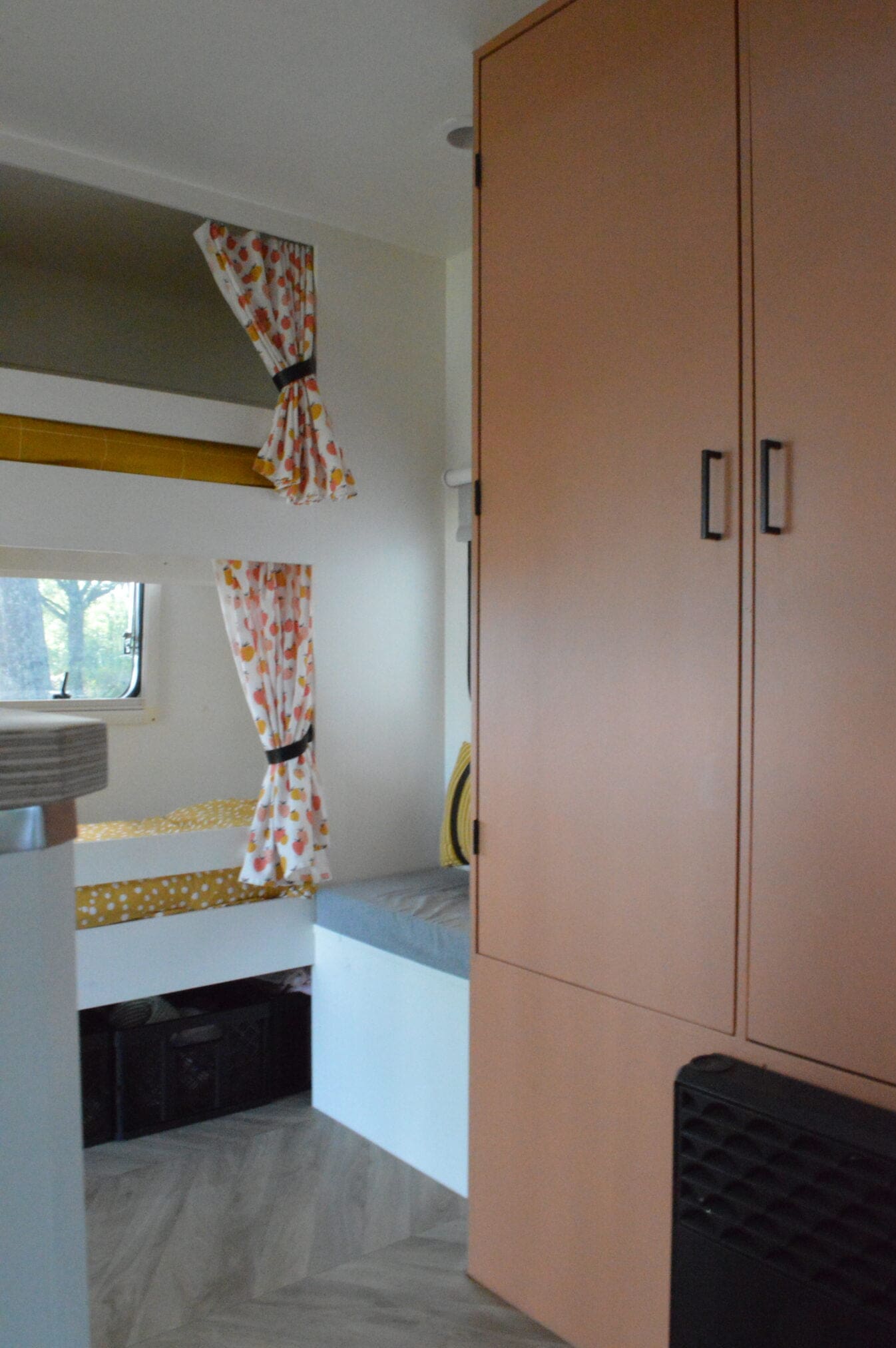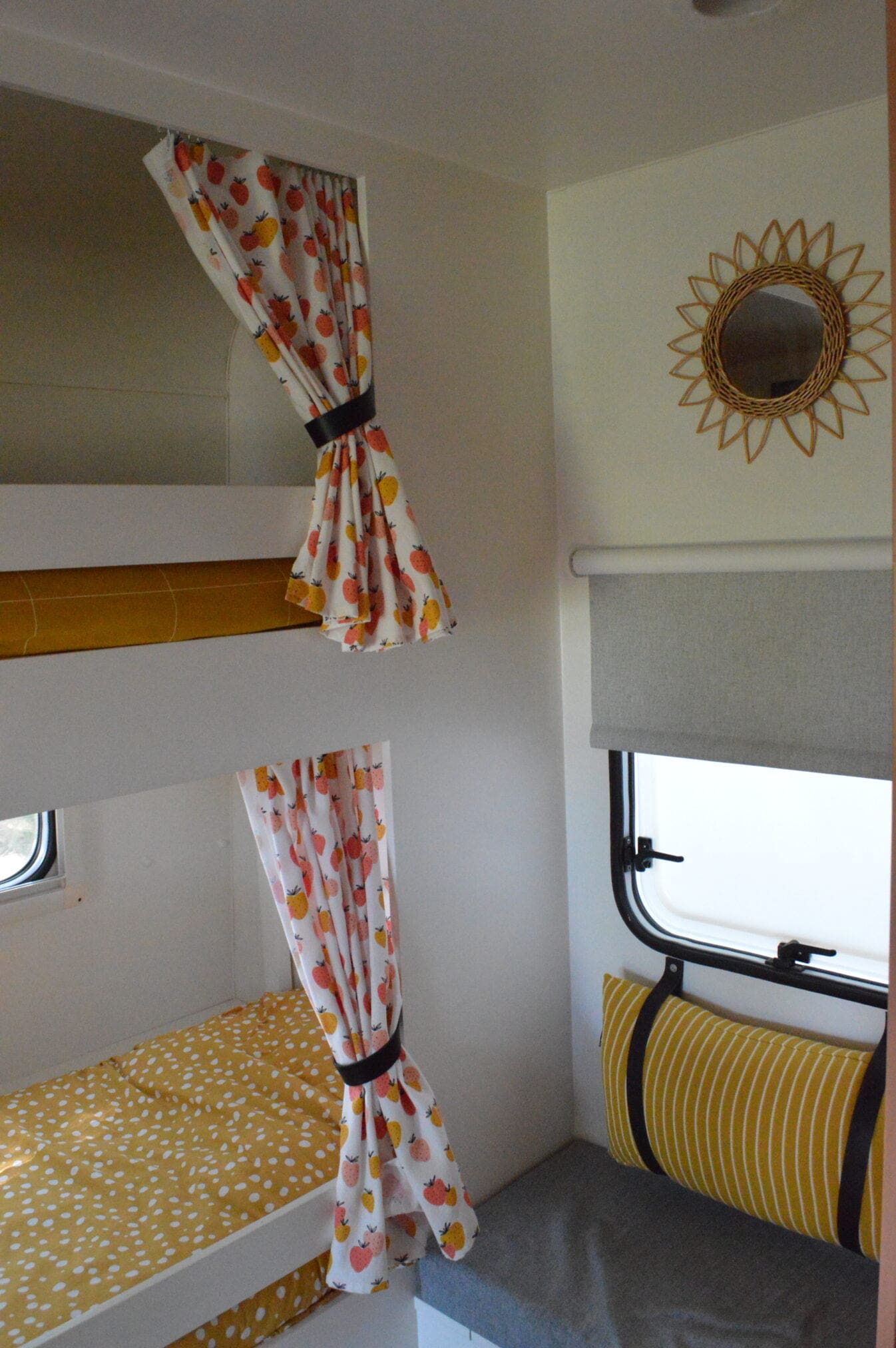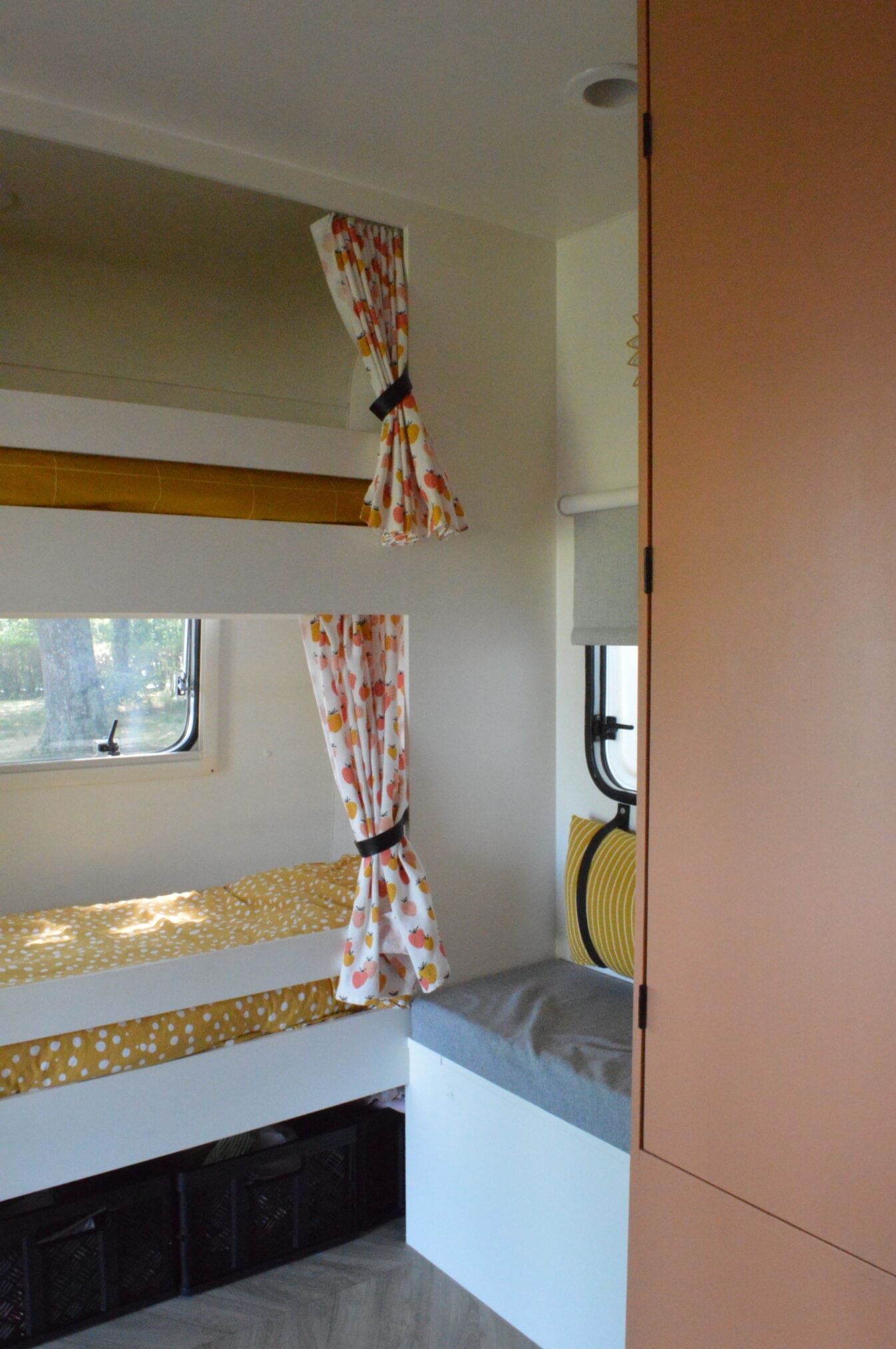 Waar ik in onze caravan heel blij mee ben is de gordijnen bij het stapelbed van de kinderen. Ze hebben allebei hun eigen gordijntjes, waardoor het echt hun eigen plekje is. Daarnaast is het ook fijn dat als de jongste eerder naar bed gaat je het goed af kan sluiten. Willen wij ’s avonds nog even een filmpje in bed kijken en het licht aandoen? Dan is dat geen probleem, door de gordijnen hebben de meiden daar geen last van.