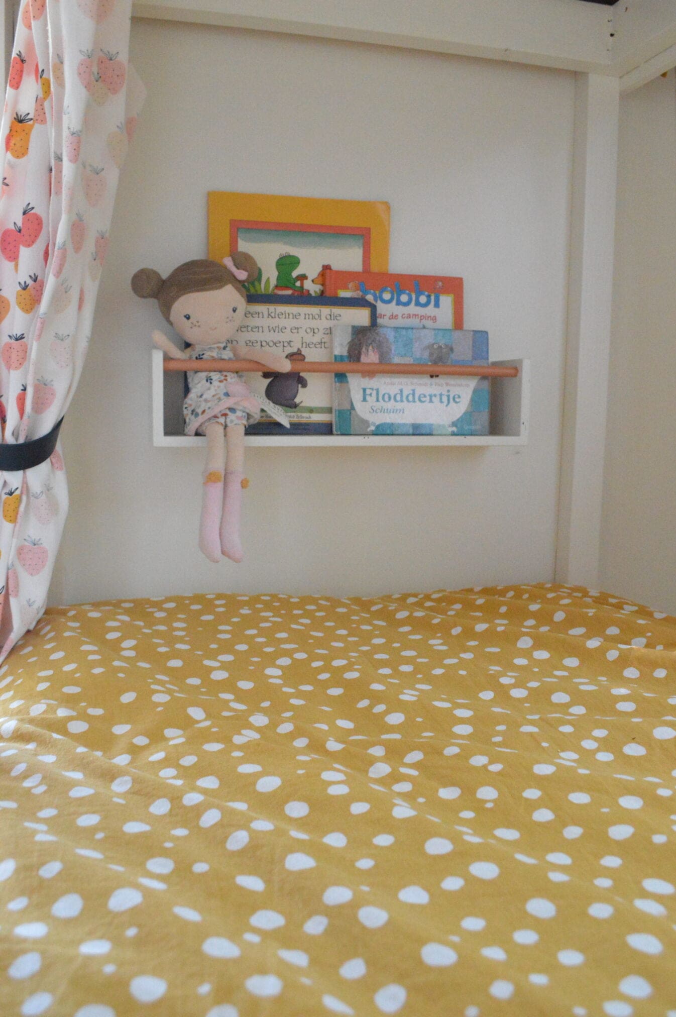 In het boekenrekje bij het voeteneinde kunnen de meiden hun persoonlijke favorieten stallen, zoals kinderboeken en een knuffel.
