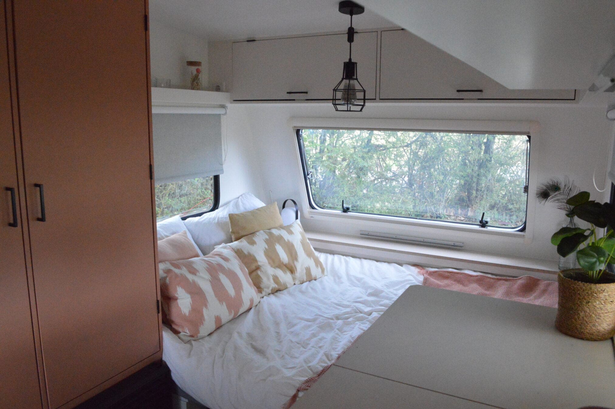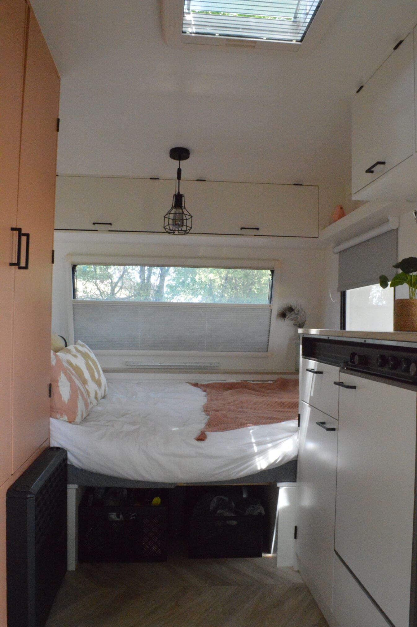 Daan en Yvonne slapen aan de andere kant van de caravan. Hier hebben ze een tweepersoons bed gemaakt.