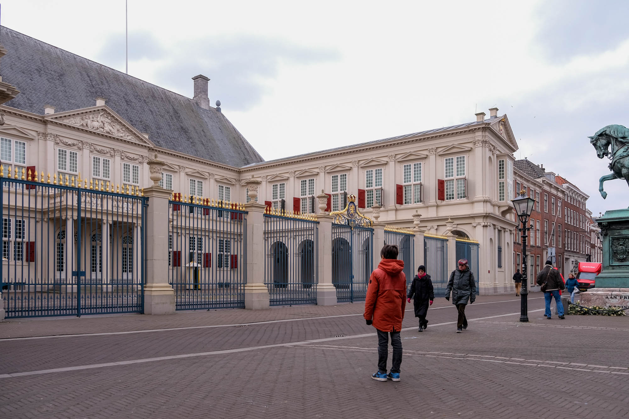 Je hoeft niet eens echt op zoek te gaan naar het werkpaleis van onze koning, want te midden van de drukke winkelstraten doemt opeens het hek voor je neus op. Hangt de vlag uit? Dat wil helaas niet meteen zeggen dat de koning daadwerkelijk aanwezig is. De vlag wappert namelijk als koning Willem-Alexander in Nederland is, niet per se in Den Haag.