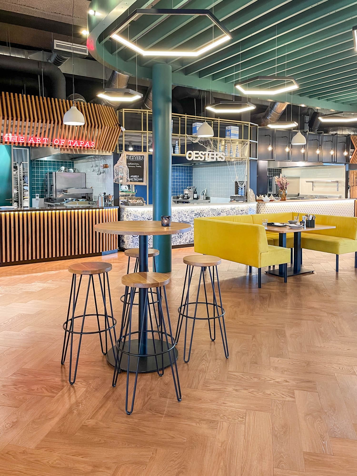 Je neemt plaats aan een van de hoge of lage tafeltjes in het midden van de ruimte, of helemaal achterin bij de grote ramen, waarbij je uitkijkt over de A2. Om je heen zijn alle barretjes, waar er in het zicht van de gasten de lekkerste gerechten worden bereidt.