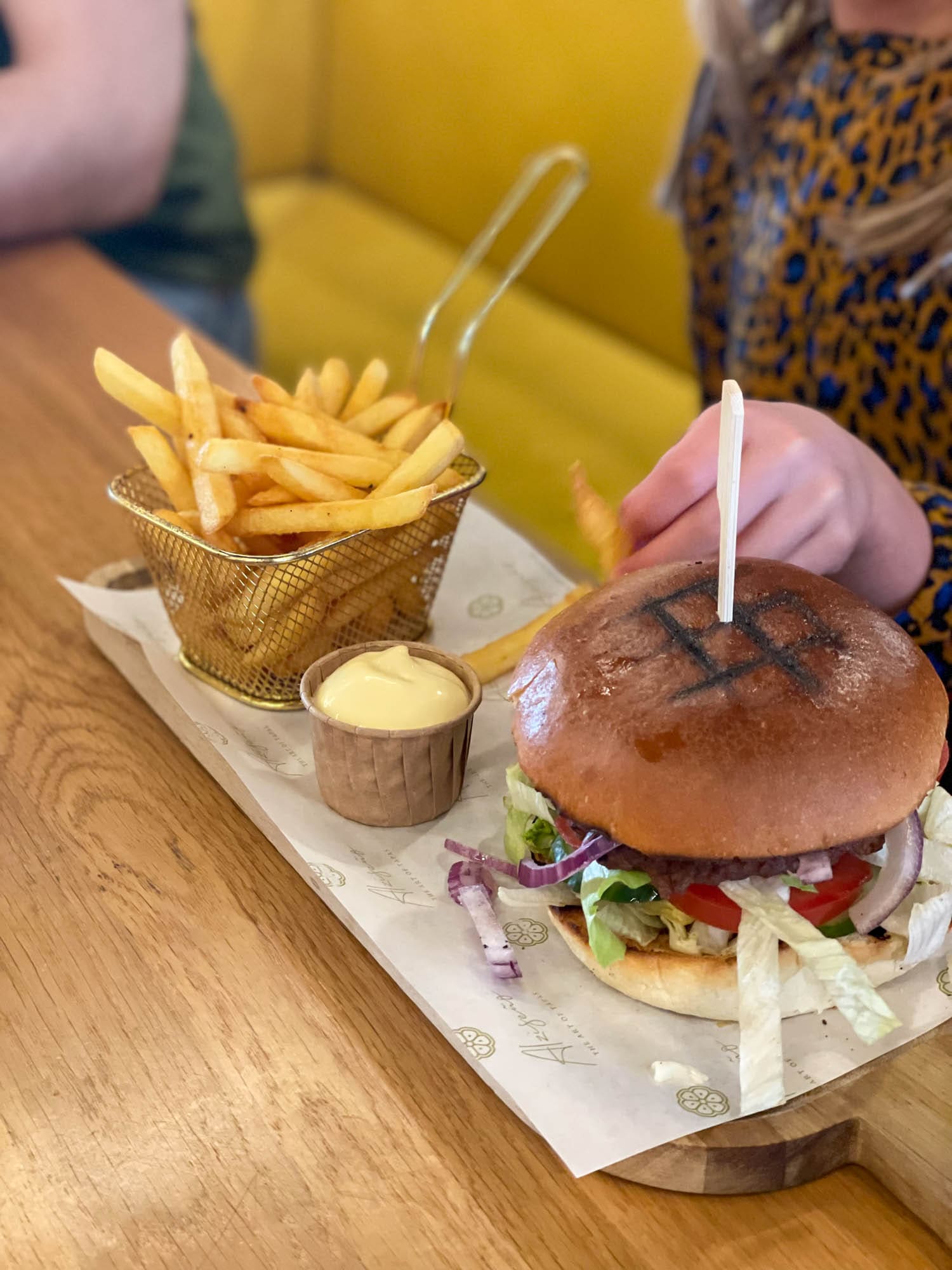 Voor de kinderen was er eigenlijk alleen een kindermenu, bestaande uit friet met een snack. Daar hadden ze alleen niet zo heel veel zin in, dus bestelden we The Gardener bij Master Burger en BBQ. Deze vega burger met Beyond Meat vlees sneden we door tweeën, zodat ze allebei een helft hadden. Uiteraard gingen de bijbehorende patatjes wel helemaal op.