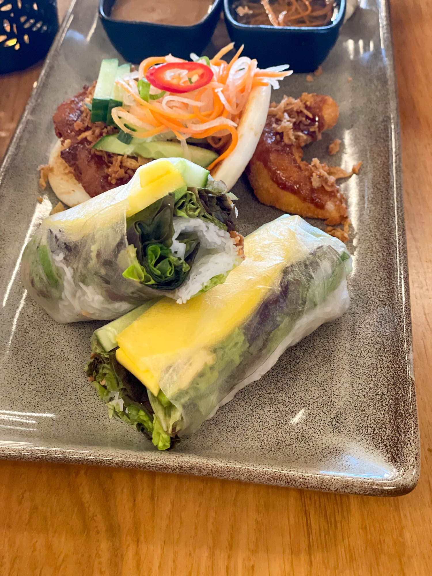 Samen met mijn vriend deelde ik een vegetarische platter van Papa Wong, met daarop vegetarische Aziatische hapjes, zoals springolls, dumplings en een vega gamba. Bij dit gerecht zit één bao bun met vega vlees, dus bestelde ik voor mezelf een bao bun met vegetarische gamba’s erbij.