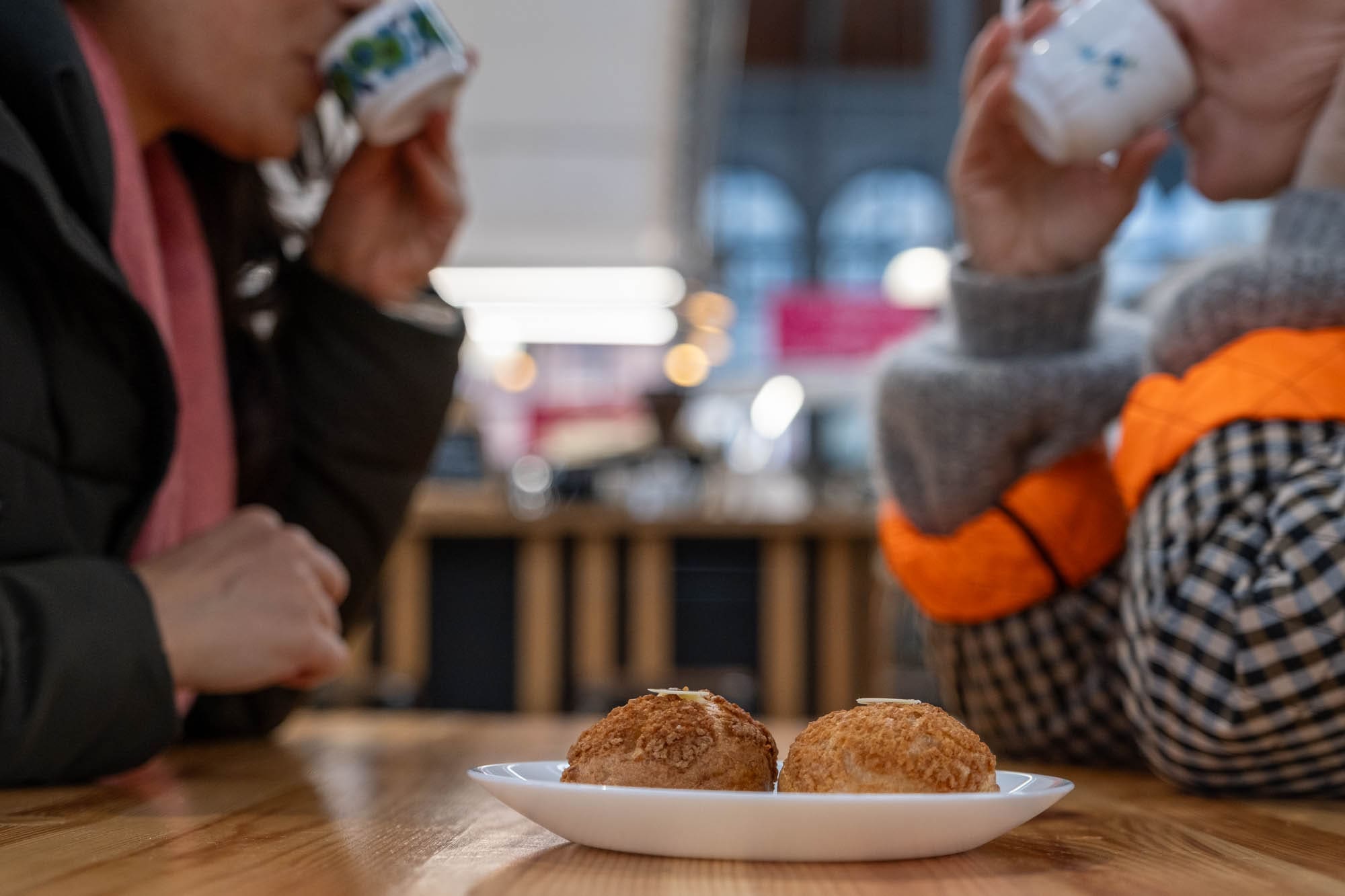 In het midden van de markthal staan houten biertafels. Rondom deze picknick-plek vind je tentjes waar je wat lekkers kunt bestellen. Wij begonnen de ochtend met een vers kopje thee en een vanillesoes. Maar later op de dag kun je ook pizza bestellen of een vega Thai Box met verse groenten.