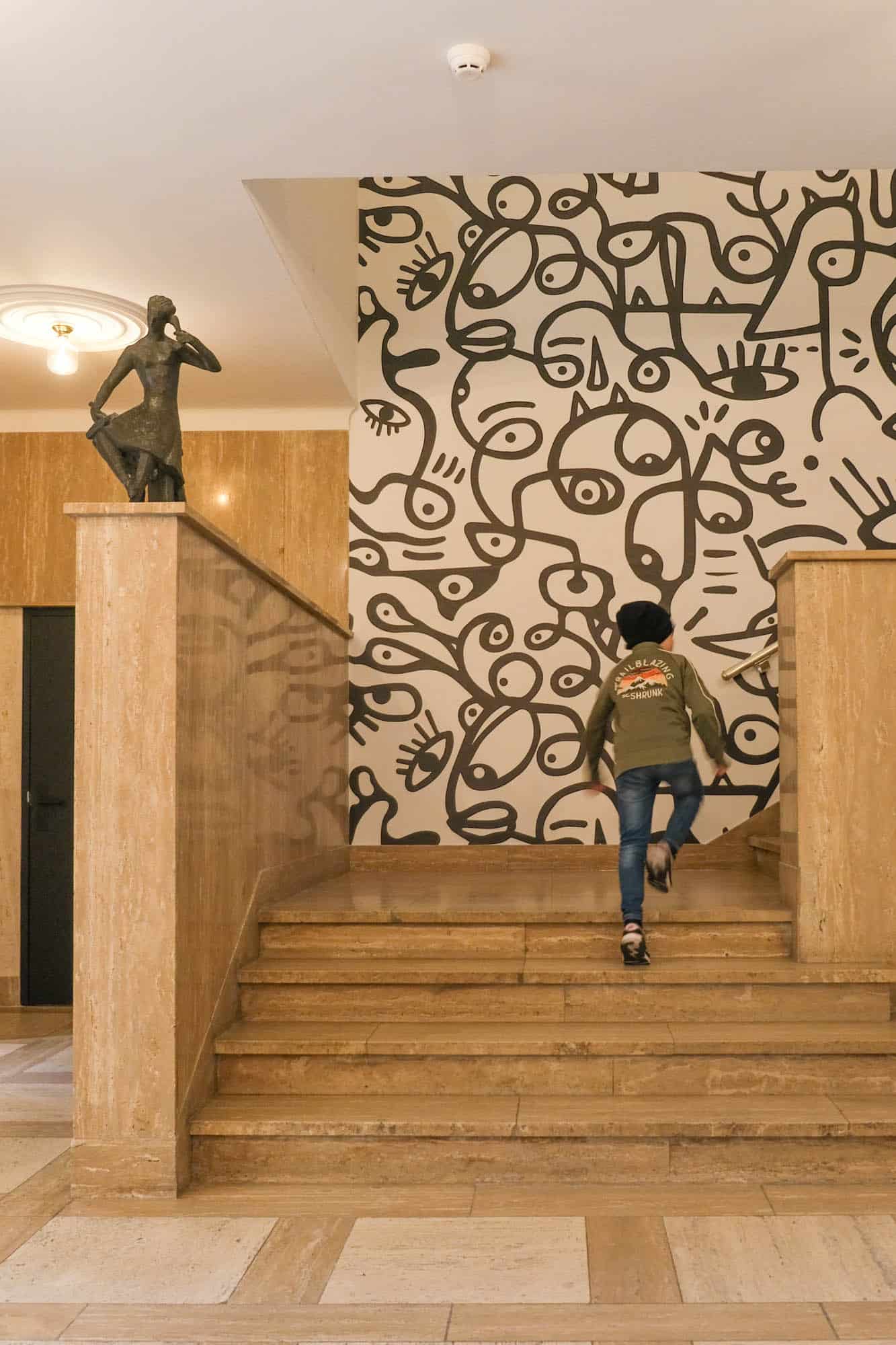 Ik kan je aanraden om niet de lift, maar de trap te nemen om naar je hotelkamer te gaan. In het trappenhuis zie je de oude ronde ramen, betegelde trappenhuizen en prachtig glas-in-lood.