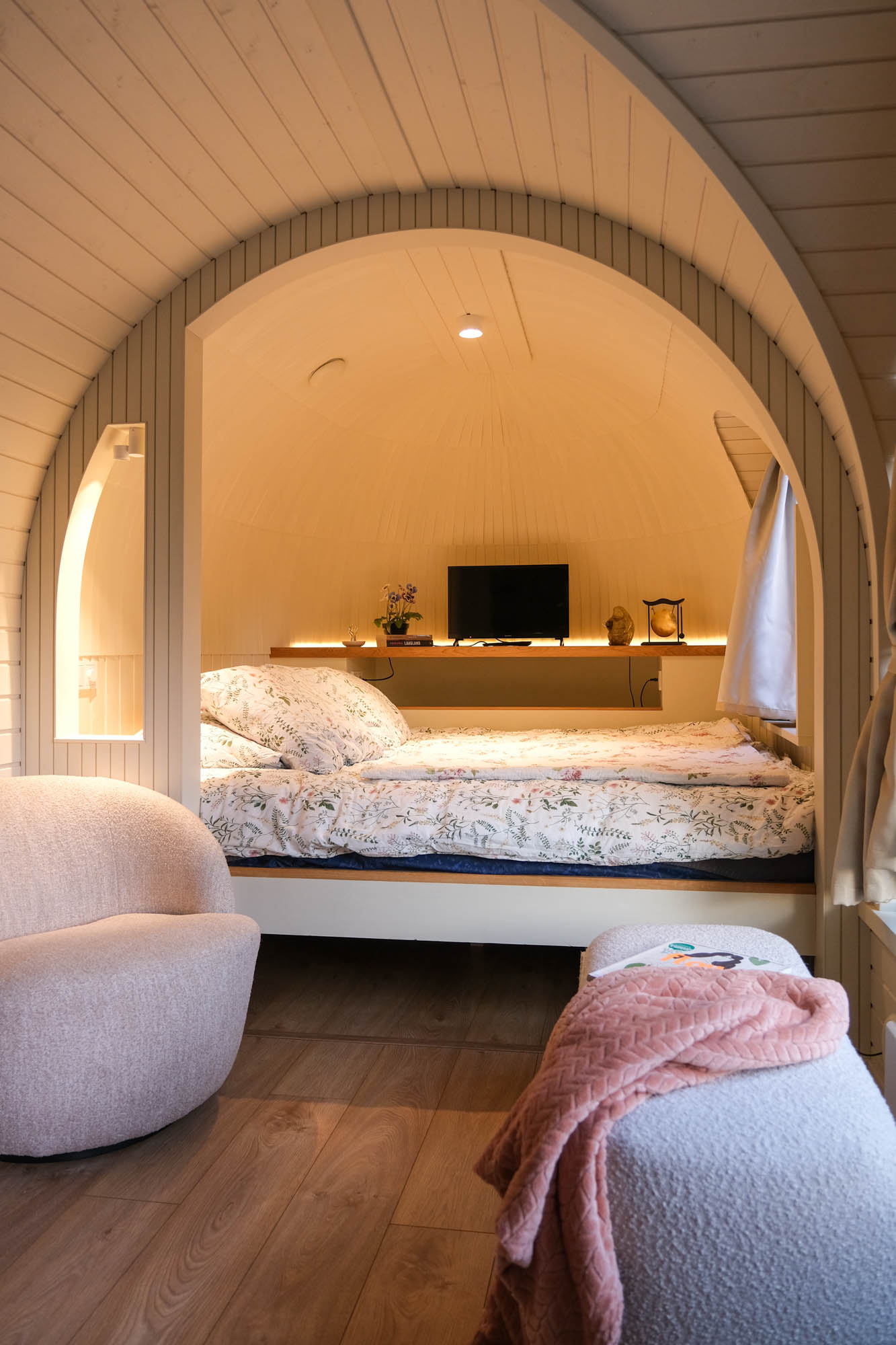 Je slaapt hier in een soort bedstee met een tweepersoonsmatras. Vanuit bed kun je lekker tv kijken of een goed boek lezen. Normaal gesproken moet ik altijd een beetje wennen aan een nieuwe omgeving, maar ik heb hier twee nachten voortreffelijk geslapen!