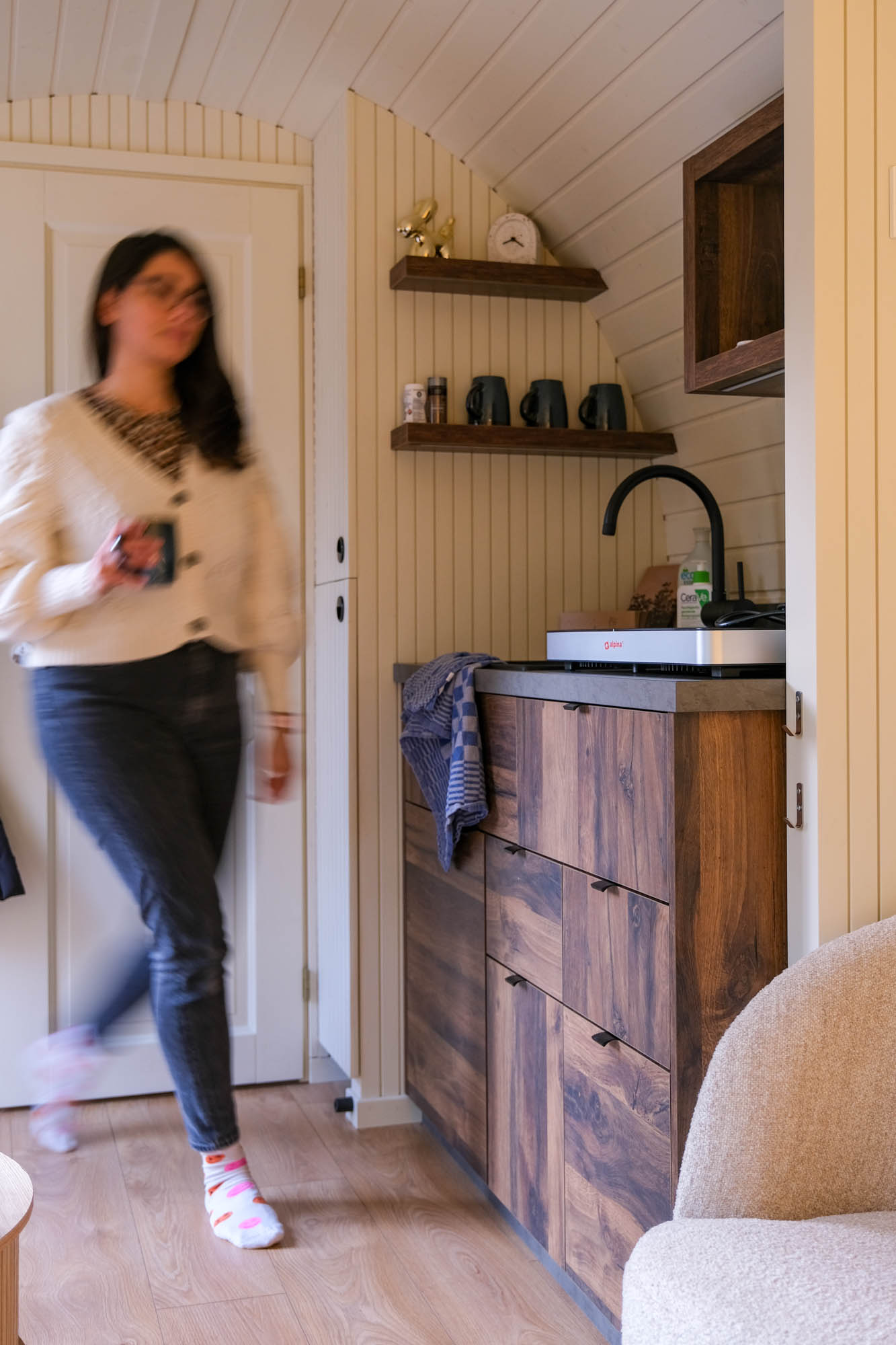 Bij binnenkomst stap je direct de keuken in. Hier vind je onder andere een kleine koelkast, een elektrische kookplaat en een waterkoker. Een grotere koelkast is te vinden in de kinderkamer. Je hoeft in principe niets mee te nemen, aan alles is gedacht. Bij aankomst ligt er een schone theedoek en handdoek voor je klaar, net als een schuurspons, afwasmiddel en handzeep. Ook liggen er koffiecups en (Pickwick) theezakjes klaar in de IGLU Family Cabin.