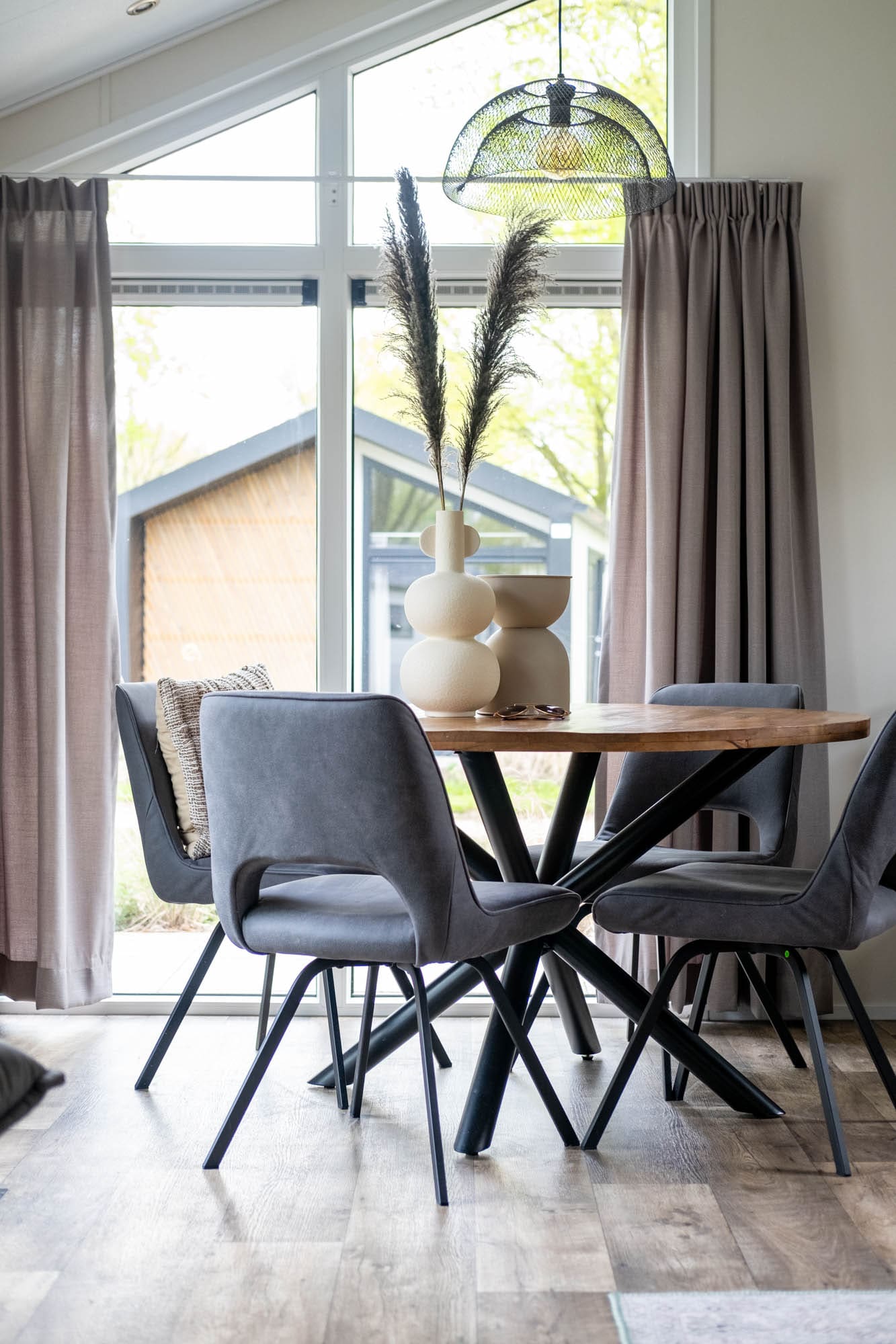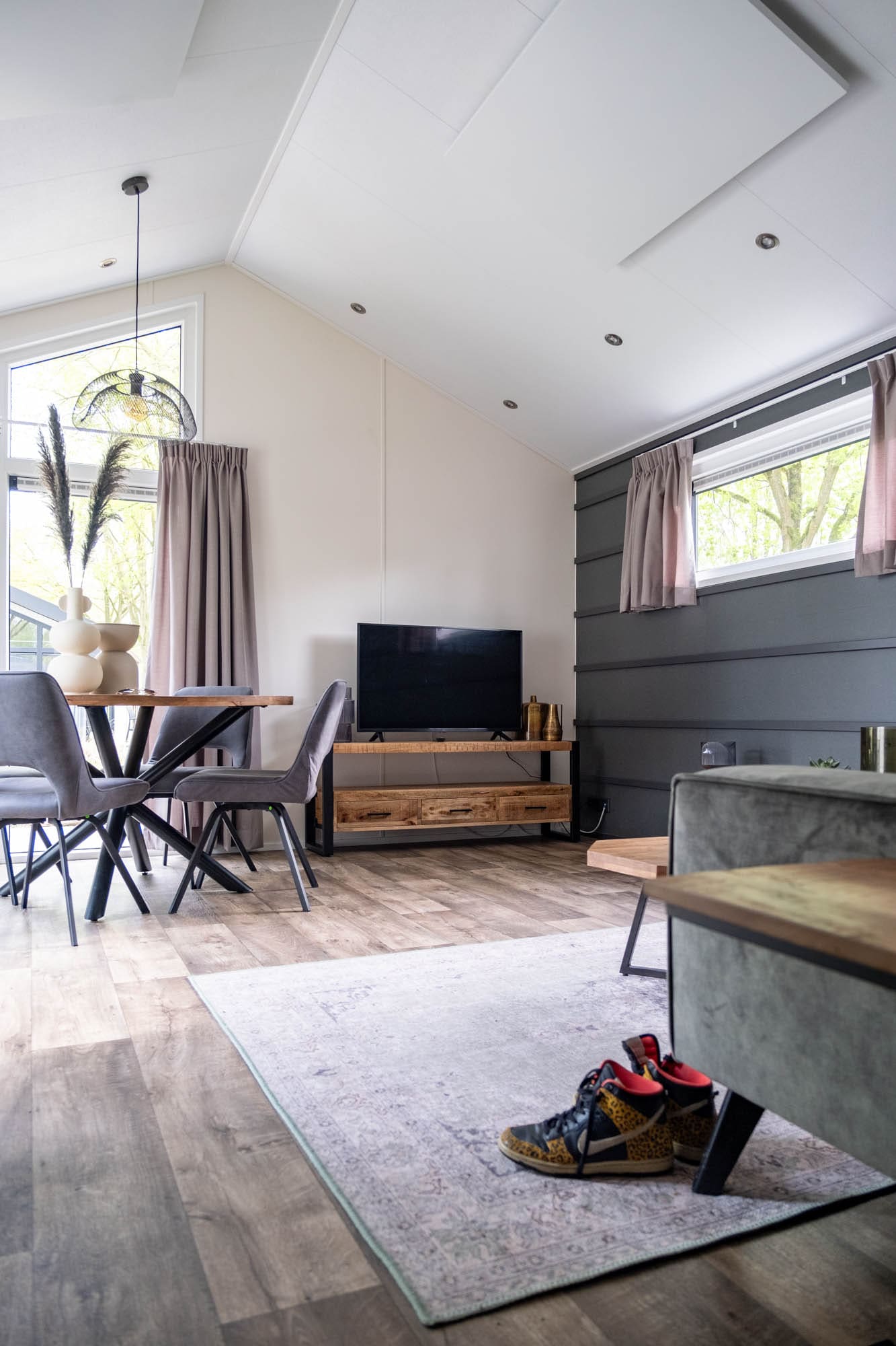 Bij binnenkomst stap je meteen in de living. Hier vind je onder andere een kleine eethoek met een ronde eettafel en 4 comfortabel stoelen. Door de grote ramen komt er overdag lekker veel licht naar binnen.