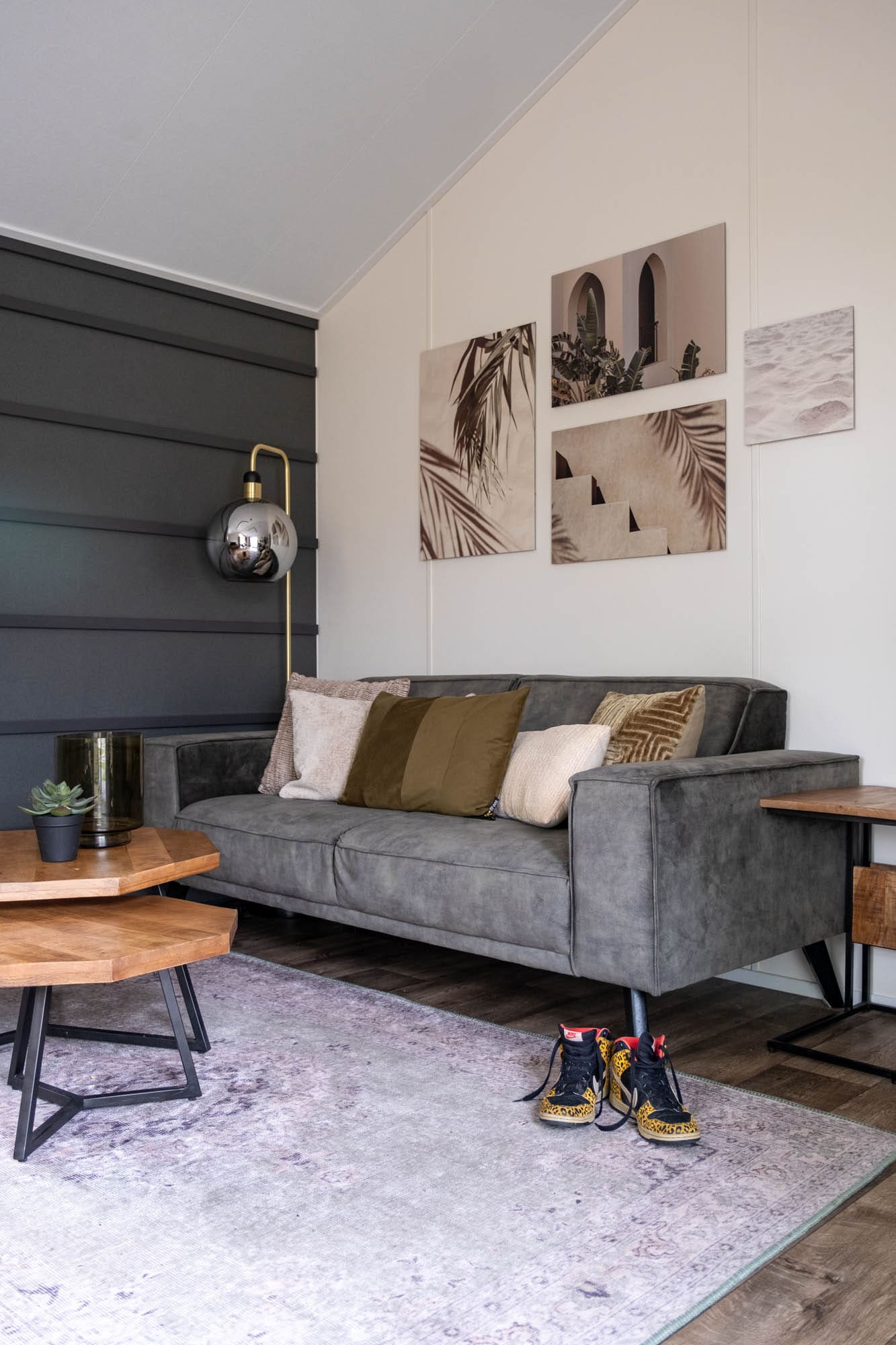 Verder zie je in deze ruimte een klein bankstel met twee salontafels ervoor. Naast de bank staat een grote schemerlamp. In de andere hoek van de kamer staat nog een extra fauteuil.