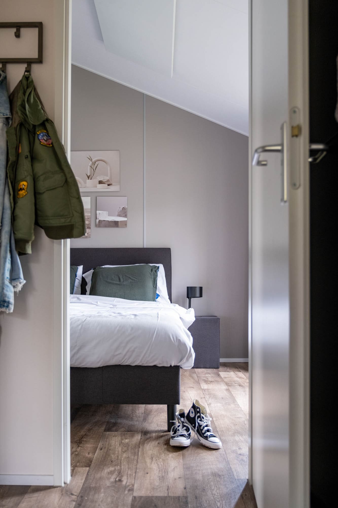 Aan het einde van de Kids Adventure Cottage 2+2 is de grote slaapkamer te vinden. Hier staat een tweepersoonsbed met nachtkastjes aan weerszijden. Ook is hier een royale kast gemaakt met zowel legruimte als hangruimte. Hier vind je ook het droogrek.