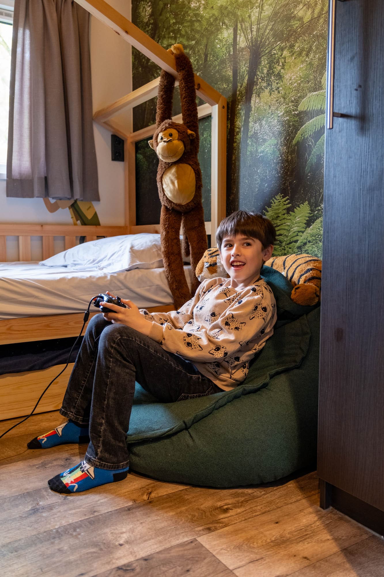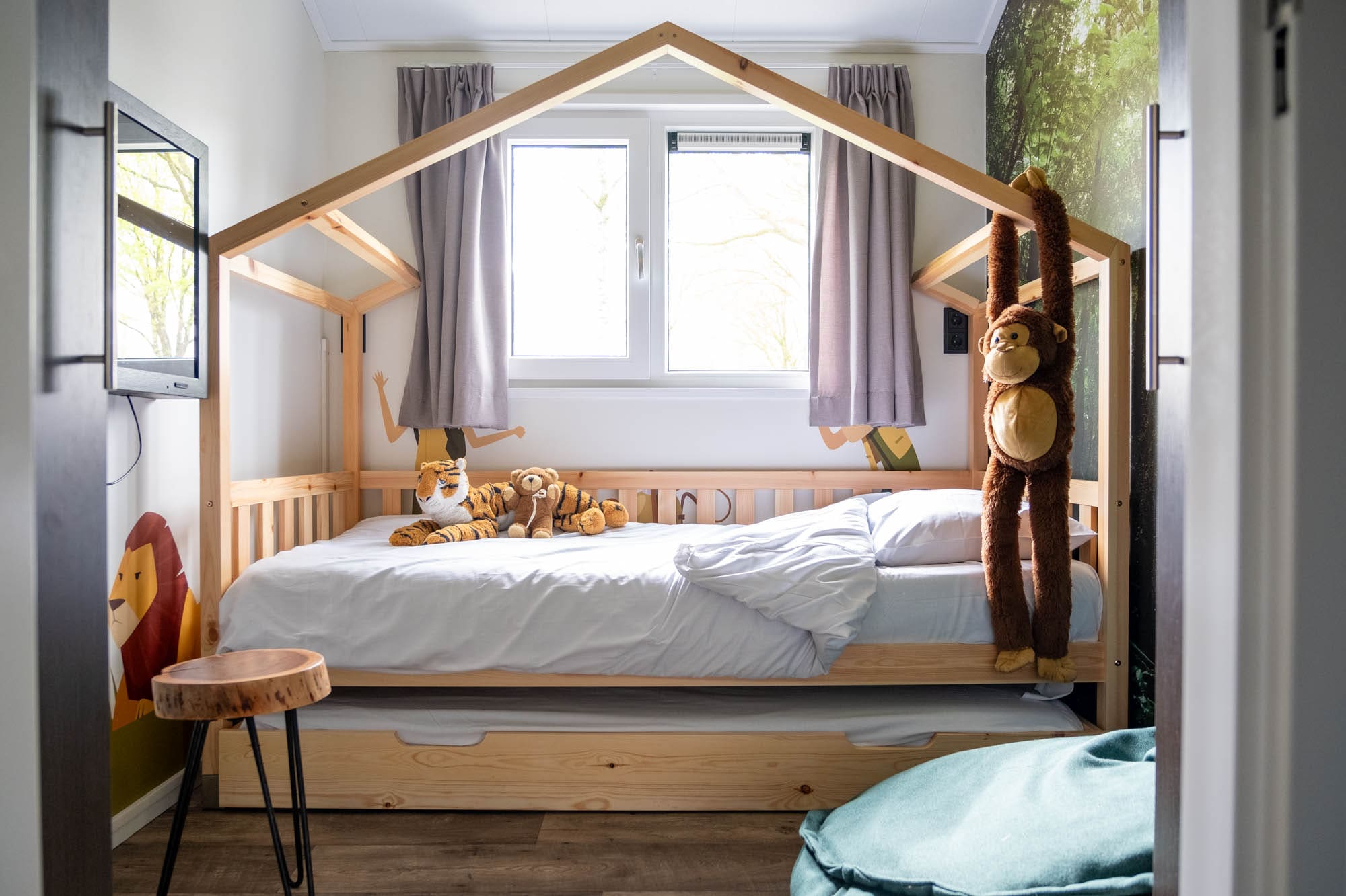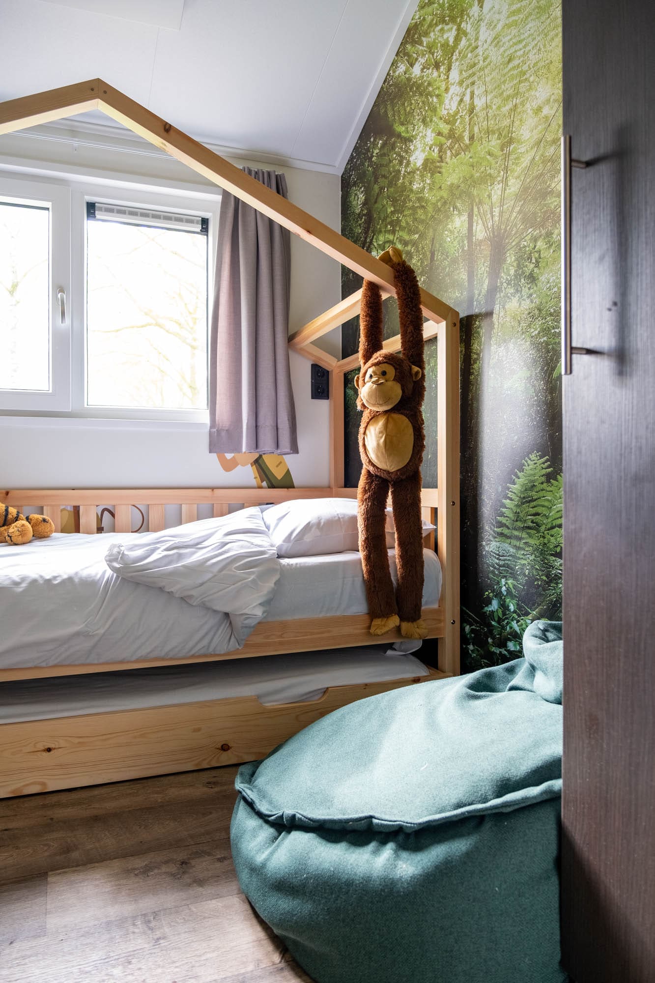 In het midden van de gang zit de deur naar de kinderkamer: Eigenlijk wel hét klapstuk van deze accommodatie. Dit is waarom dit vakantiehuisje de Kids Adventure Cottage heet. De ruimte is namelijk helemaal in jungle thema, met een houten huisjesbed, een knuffelaap, vrolijke muurschilderingen van wilde dieren en fotobehang van tropische planten.