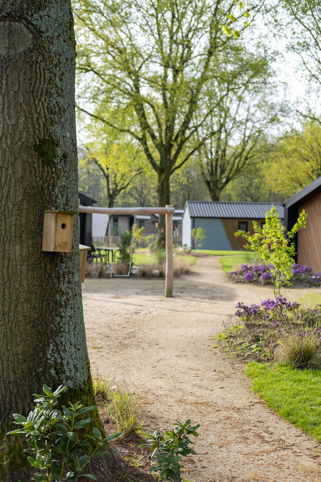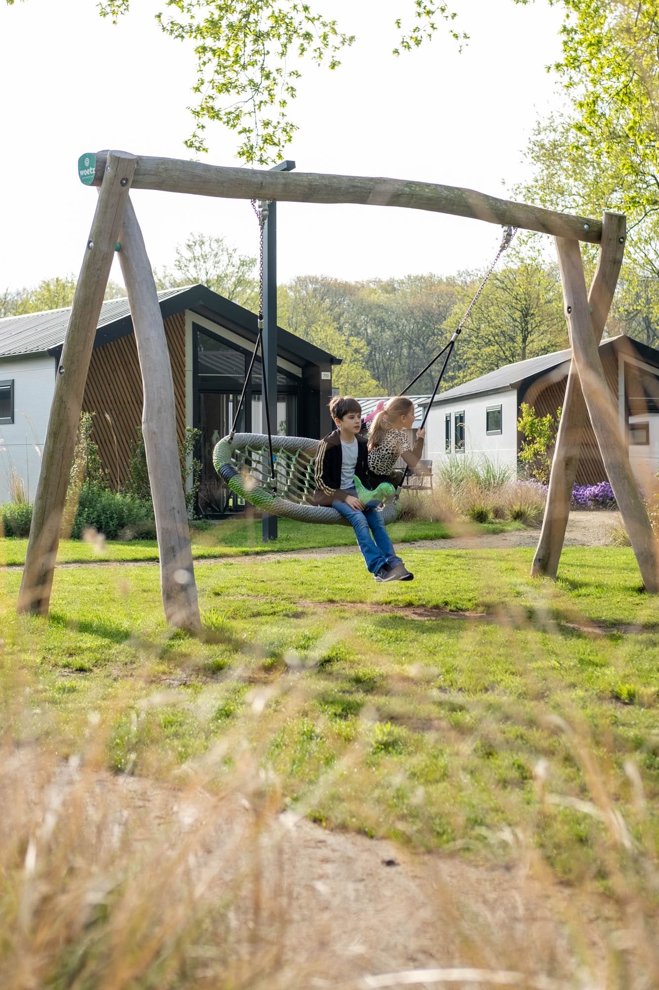 Dit type vakantiehuisjes liggen op dit park redelijk dicht bij het entree en alle andere faciliteiten. De accommodaties staan in een kringetje, met in het midden twee schommels op een grasveldje.