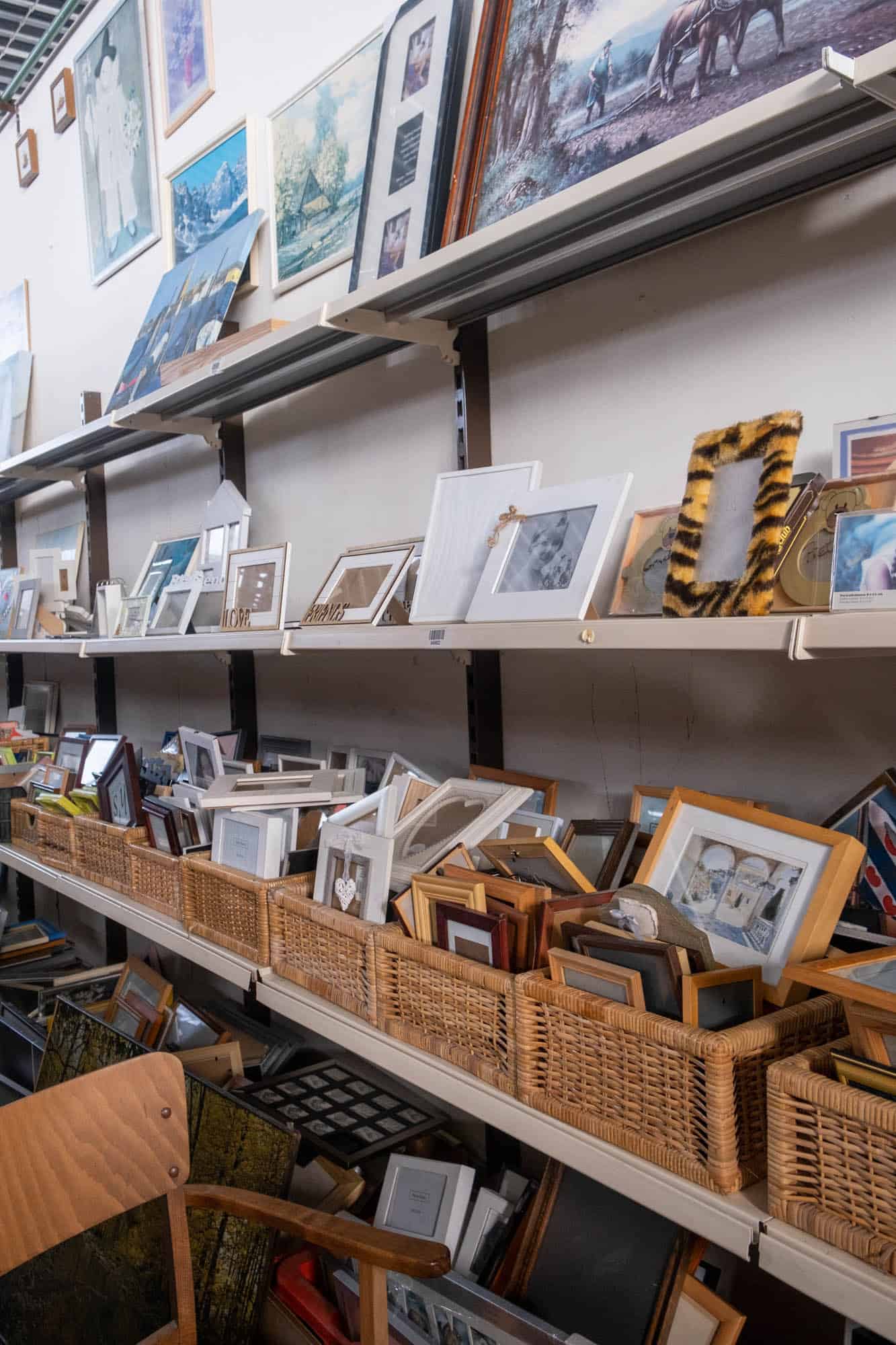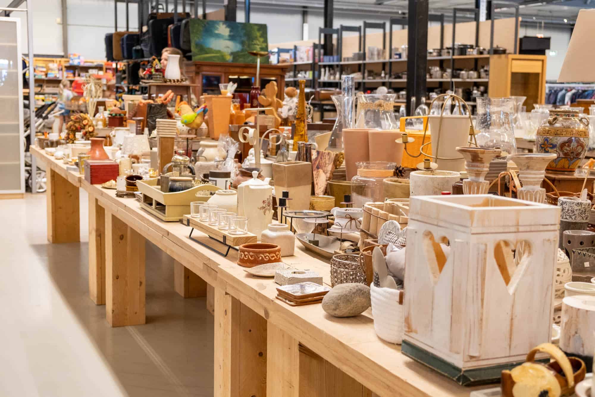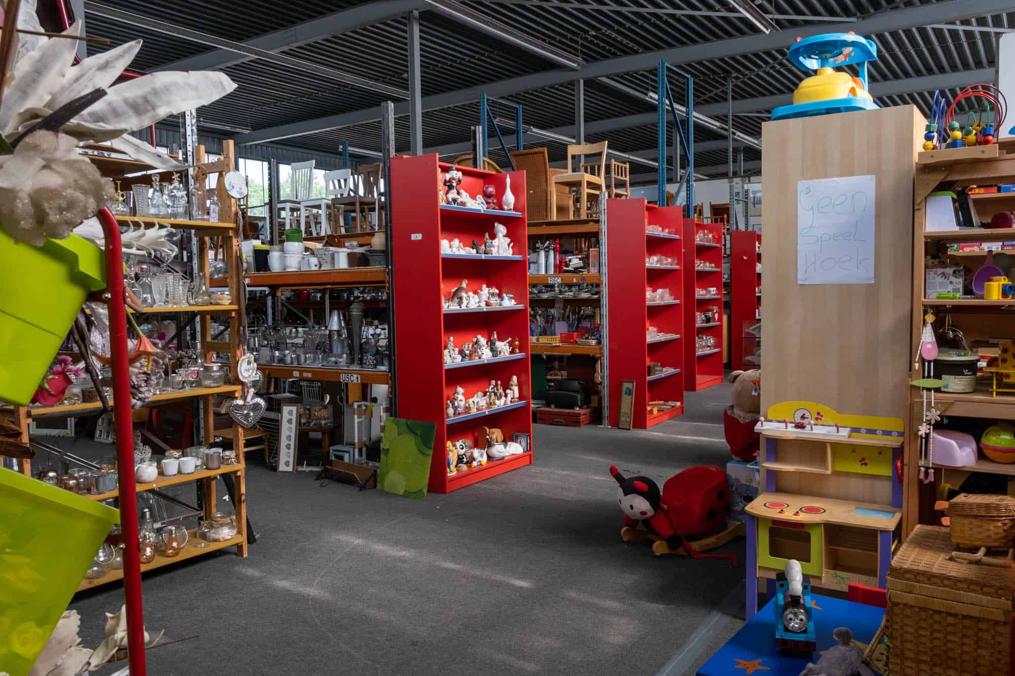 Het aanbod kan nogal overweldigend zijn als je deze gigantische kringloopwinkel binnenloopt. Overal waar je kijkt zie je tweedehands items. Van tafels vol met servies, beeldjes en lampen tot wanden vol kledingrekken en ander textiel. Gelukkig is alles wel op soort en kleur uitgestald, dus als je gericht wil zoeken, zie je in één oogopslag waar je moet zijn. Ook hier geen prijskaartjes, want bij de kassa hoor je wat de totaalprijs is. De belofte is dat hoe meer je koopt, des te voordeliger je buit wordt! Het is het proberen waard, toch..?