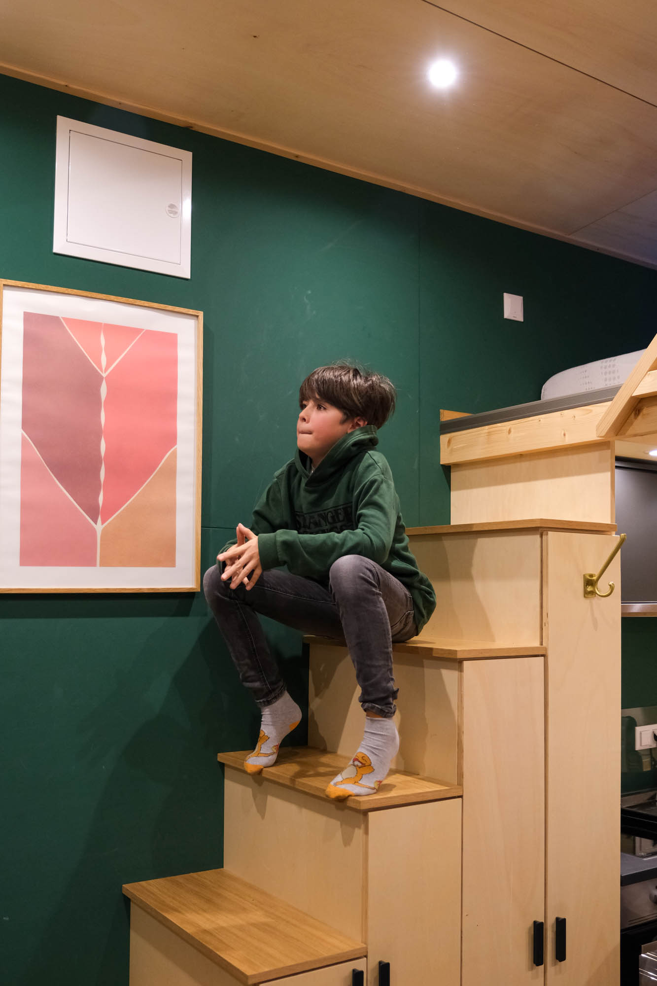 In de accommodatie zijn een aantal slimme trucs toegepast om optimaal gebruik te maken van de ruimte. Onder de trap is opbergruimte voor bijvoorbeeld een kleine koffer of voorraad.