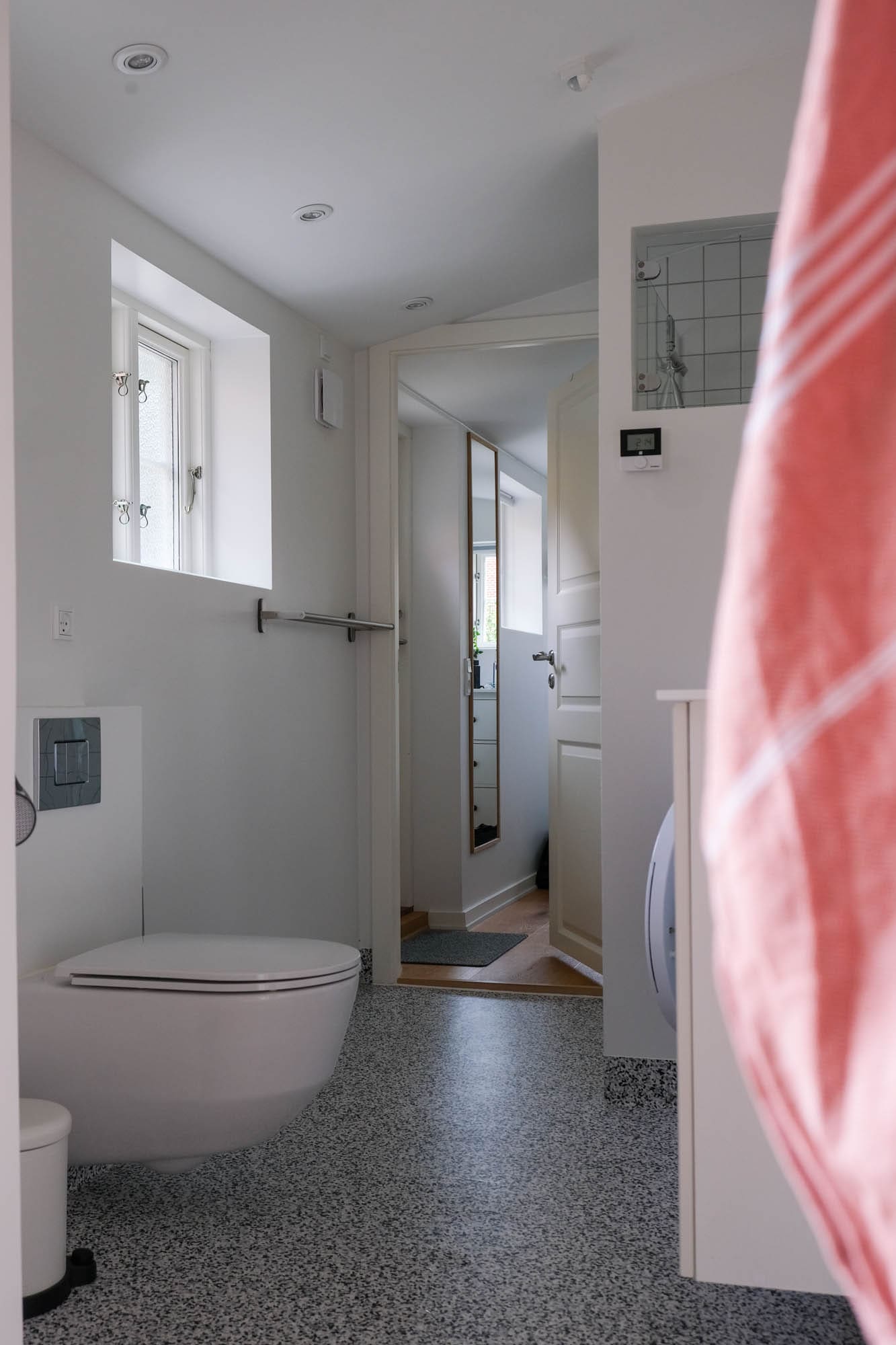 De badkamer bevindt zich op de begane grond. Hier is het toilet, een wasbak en een ruime douche.