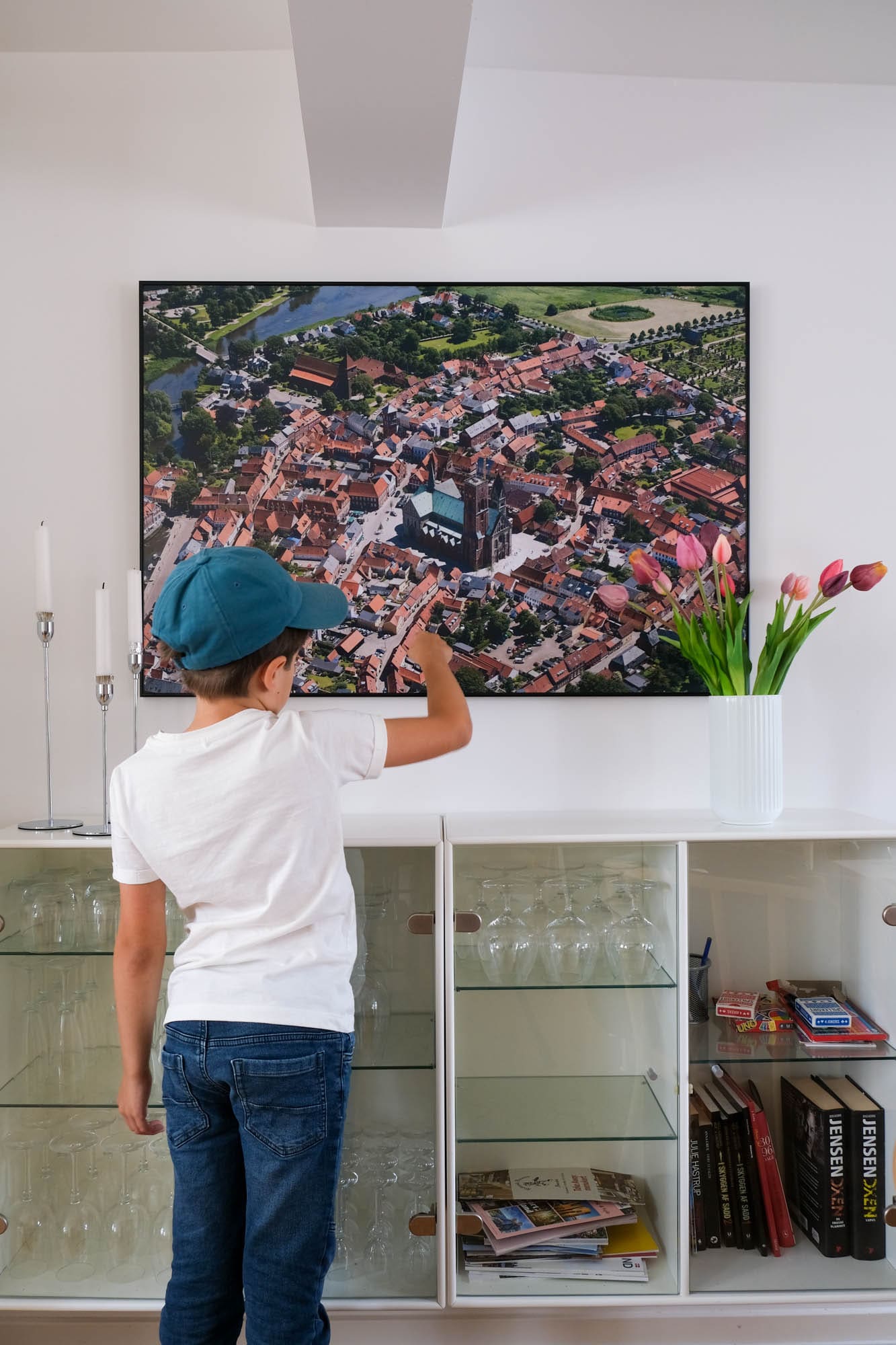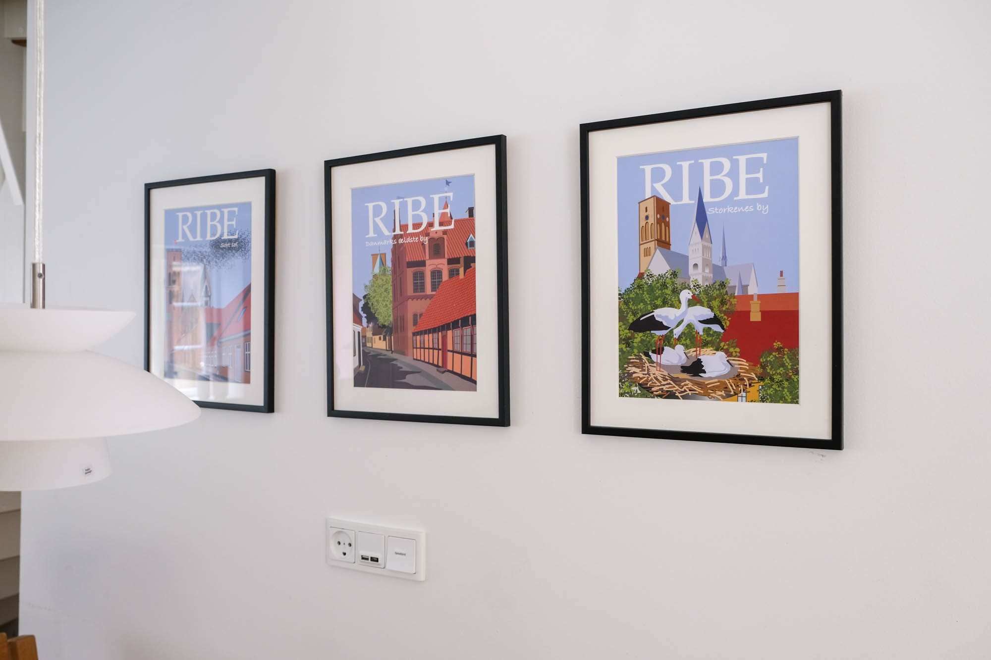 Bij de eettafel hangen 3 leuke posters met bekende bezienswaardigheden in Ribe. Aan de andere kant hangt aan de muur een luchtfoto, waar -als je goed kijkt- deze vakantiewoning ook op te vinden is.
