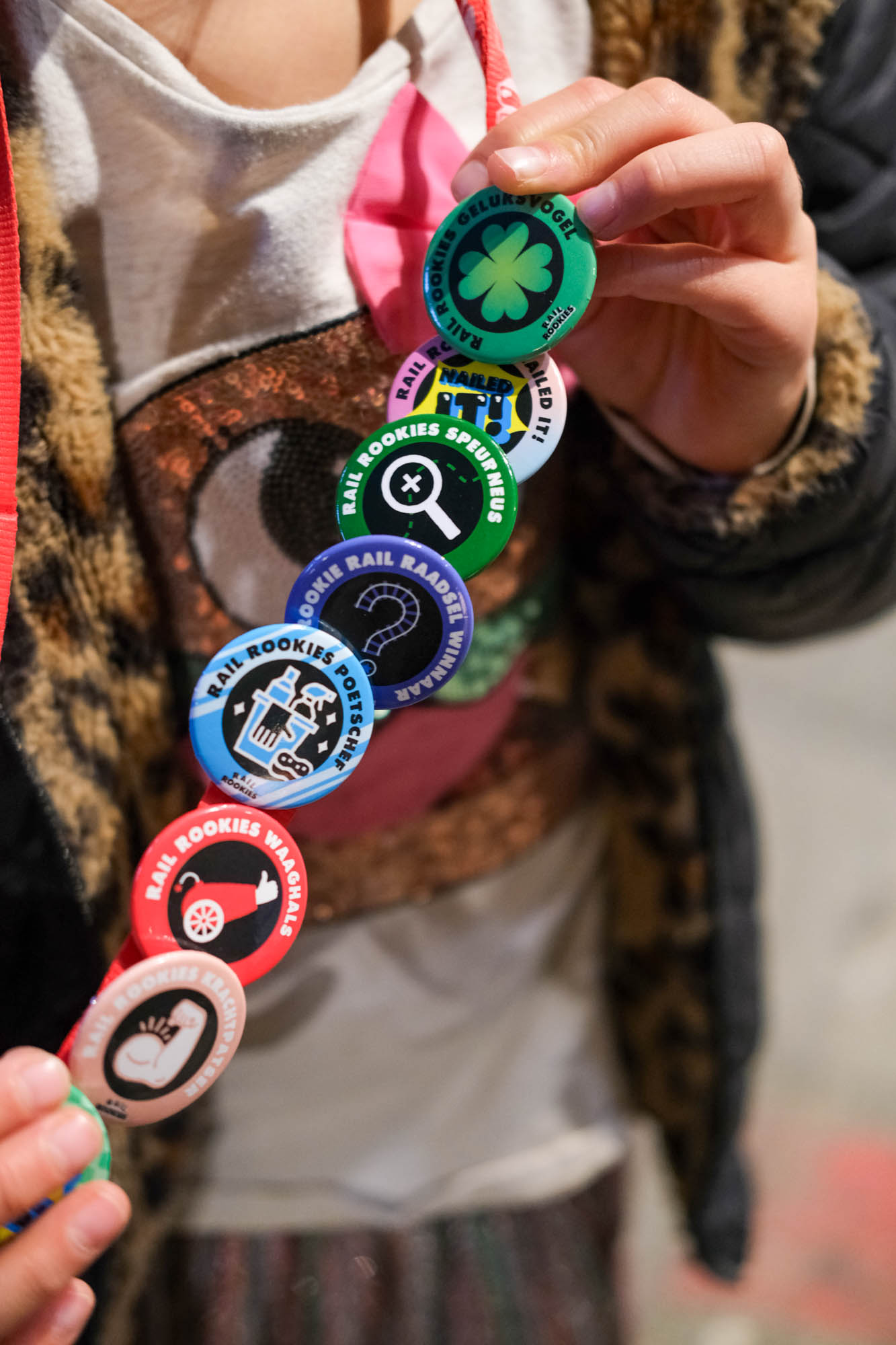 Overal door het museum kun je meedoen aan de meest uiteenlopende activiteiten. Voor de meeste activiteiten hoef je je niet in te schrijven, zoals trein poetsen, rails optillen en op zoek gaan naar de gouden bal in de ballenbak die voor de gelegenheid in een wagon is gemaakt. Na iedere activiteit krijgen de leden een button. En het is al gauw duidelijk dat dit is waar de hele dag om draait. We zien leden al binnenkomen met keycords vol buttons van voorgaande jaren (daar zijn die dingen dus voor!) en iedereen is fanatiek buttons aan het sparen.