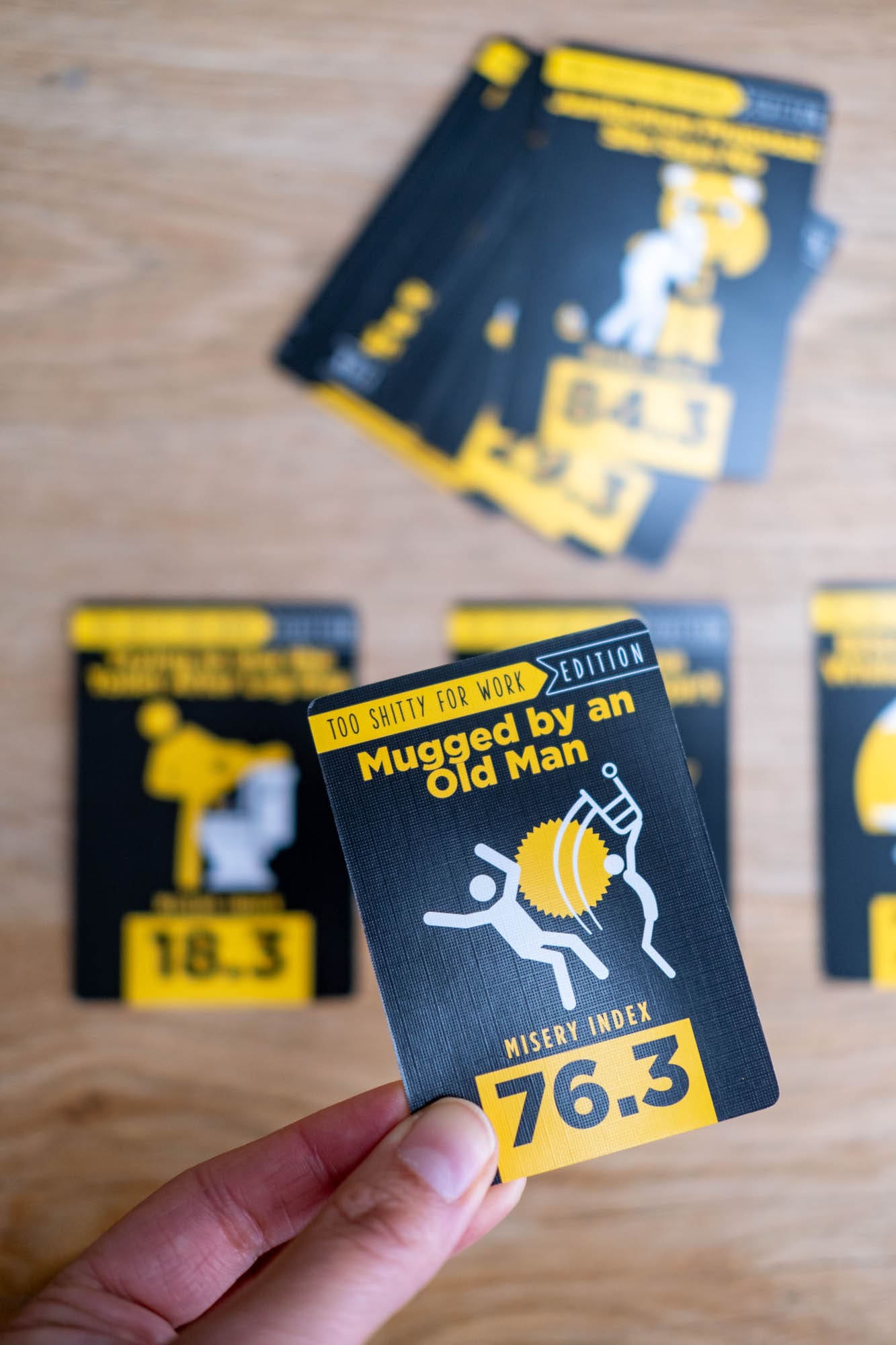 Shit Happens is een grappig spel voor volwassenen. In dit kaartendeck vind je 200 kaarten met daarop doemscenario’s. Denk aan: ‘Verwacht een biertje, maar je neemt een flinke slok augurkensap‘, ‘Je zit vast in een lift met een lijk‘ en ‘je dochter is verloofd met een drugsbaron‘. Aan jou (of je team) de taak om deze te ranken van niet zo erg naar heel erg. Raad jij hoe erg de gebeurtenissen worden ingeschat in de zogenaamde ‘ellende-index’?