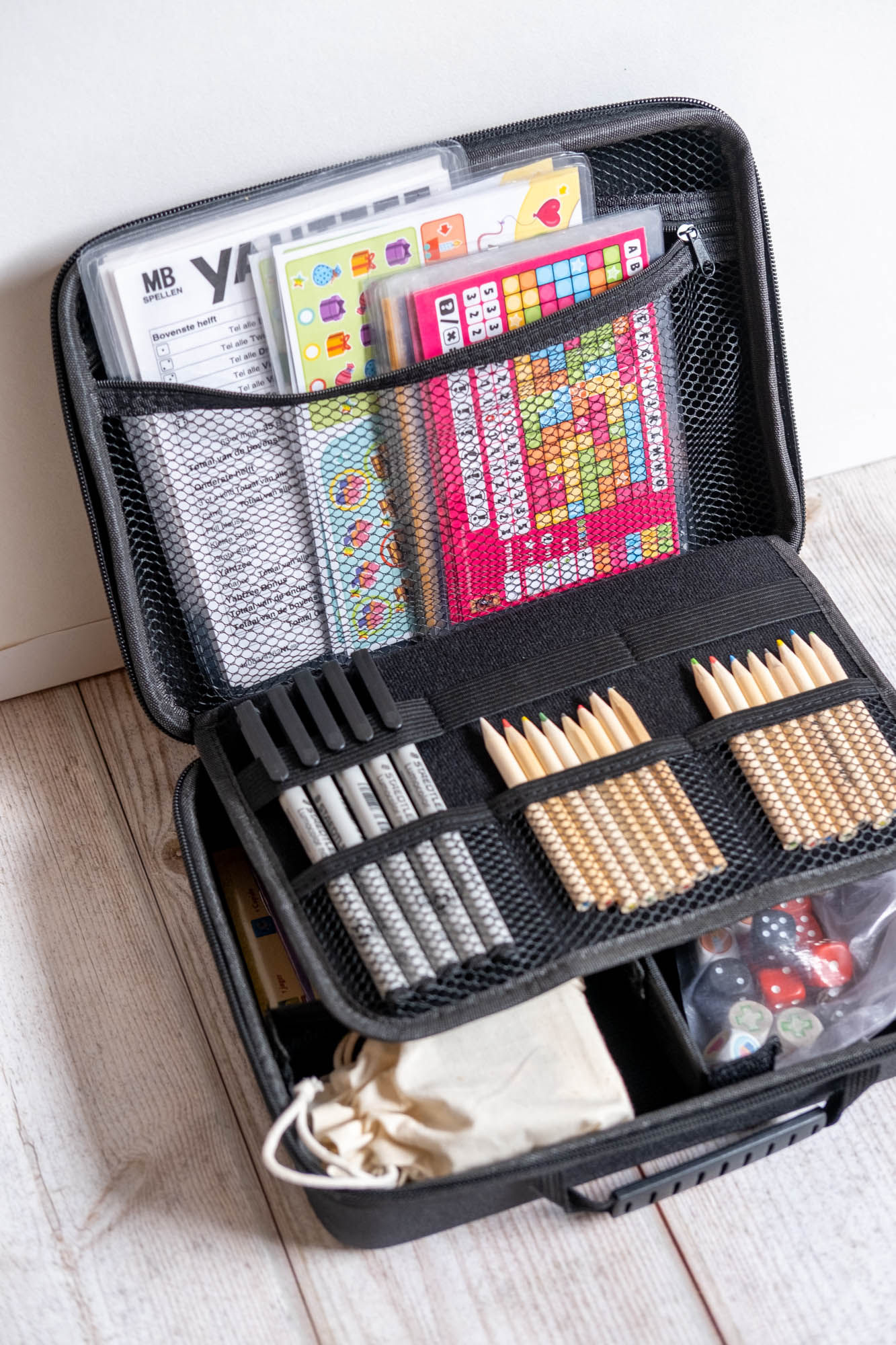 In de organizer hebben we niet alleen ruimte voor maar liefst 10 reisspellen, maar kunnen we ook kleine kleurpotloden en mini-kleurboekjes meenemen op vakantie. De kleine kleurpotloodjes krijgen kinderen vaak bij restaurants en de kleine kleurboeken koop je bijvoorbeeld bij Action. Vergeet niet een puntenslijper mee te nemen en eventueel een klein plastic zakje om het slijpsel in op te vangen!