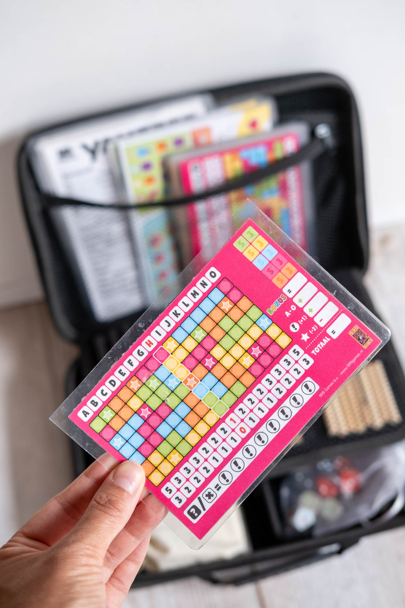 Invulbladen hebben we gelamineerd met dit lamineerapparaat. Zo zijn ze waterbestendig (dus handig als je aan de rand van het zwembad of op je handdoek aan het strand wil spelen) en eindeloos te gebruiken. Door non-permanent markers te gebruiken, veeg je ze zo weer schoon met een nat doekje of door ze simpelweg even onder de kraan af te spoelen. Nu hoeven we maar een paar kaarten mee te nemen en niet een heel blok, wat best wat ruimte scheelt.