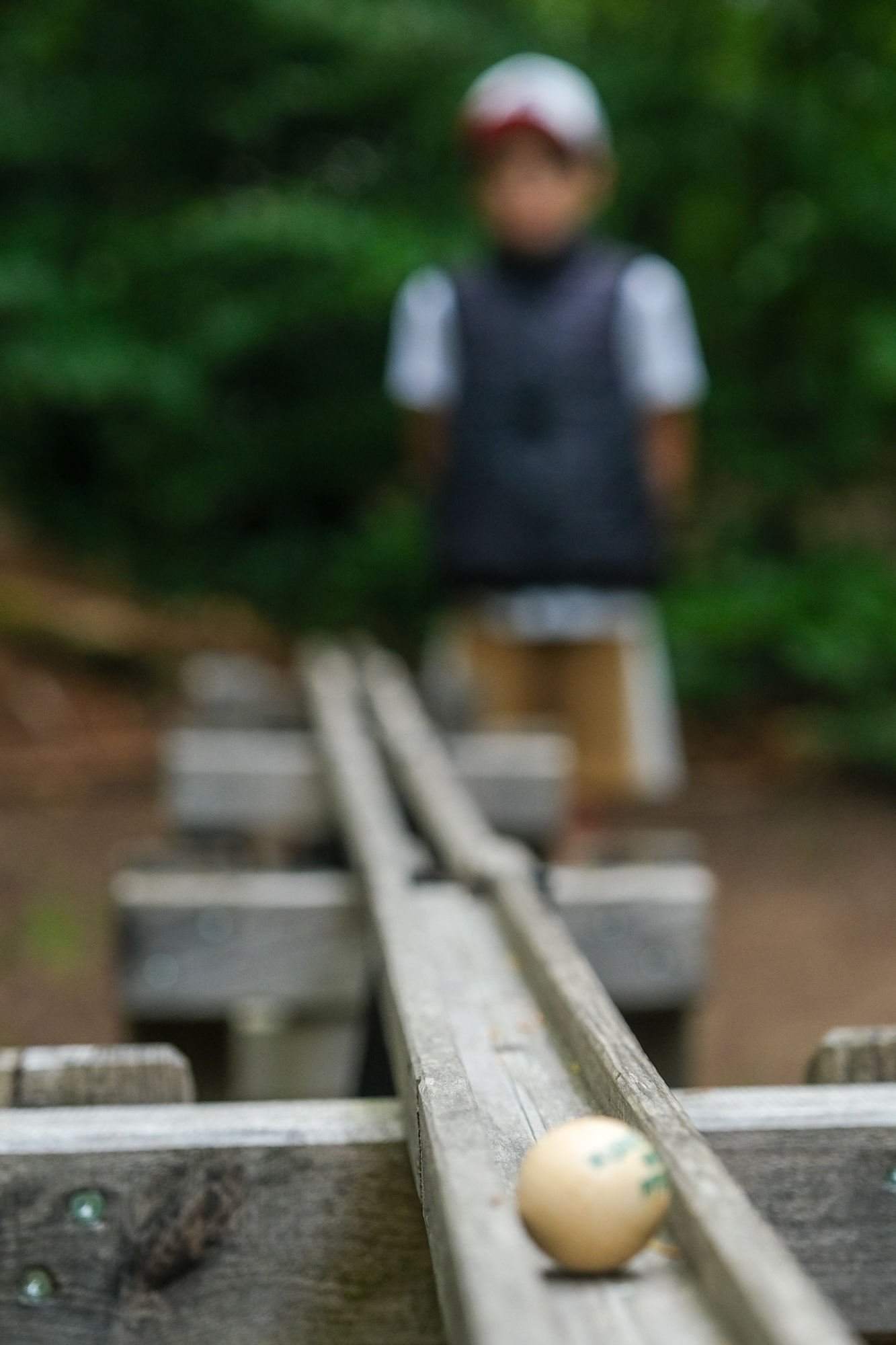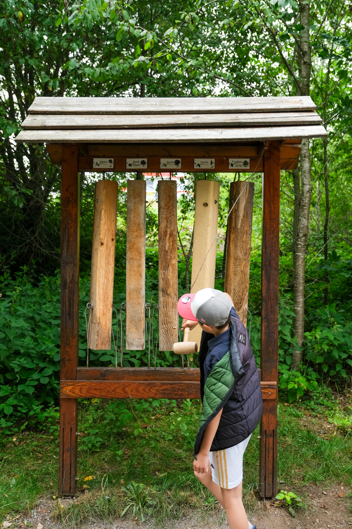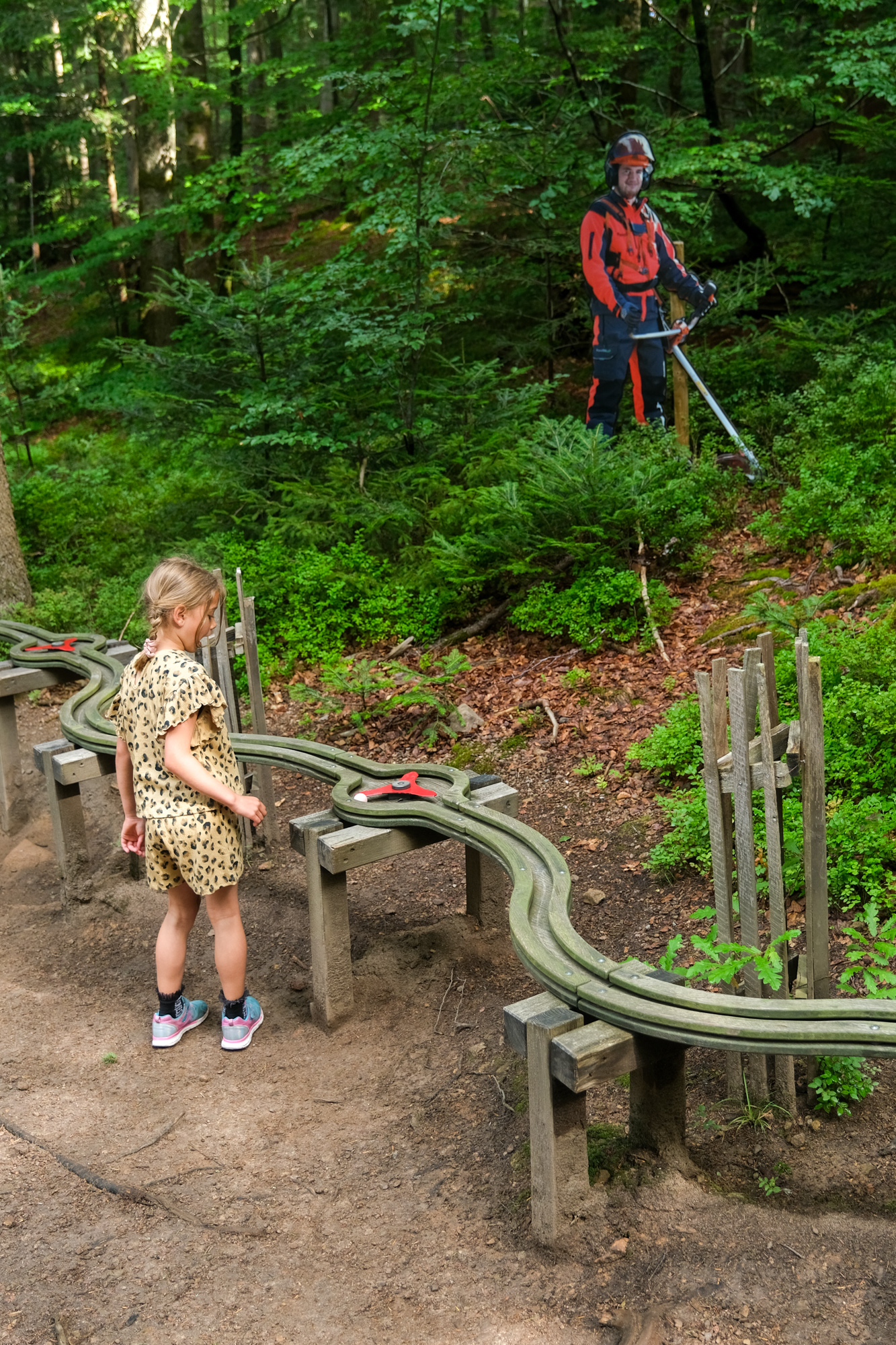 Hoog op ons lijstje stond een bezoek aan een knikkerbaan. Het knikkerpad in Ühlingen-Birkendorf was een schot in de roos. Deze route van 2.3 km start bij de parkeerplaats waar je voor een euro een houten knikker uit de automaat haalt (Let op! Alleen betalen met muntgeld en het apparaat geeft geen wisselgeld terug. Zorg dus dat je wat euro’s op zak hebt). Schaf eventueel een extra knikker aan, want je zal niet de eerste zijn die onderweg een knikker per ongeluk laat wegrollen de afgrond in. Met die wetenschap zijn wij trouwens onderweg goed langs de paden gaan kijken en vonden zelfs een verdwaalde knikker!